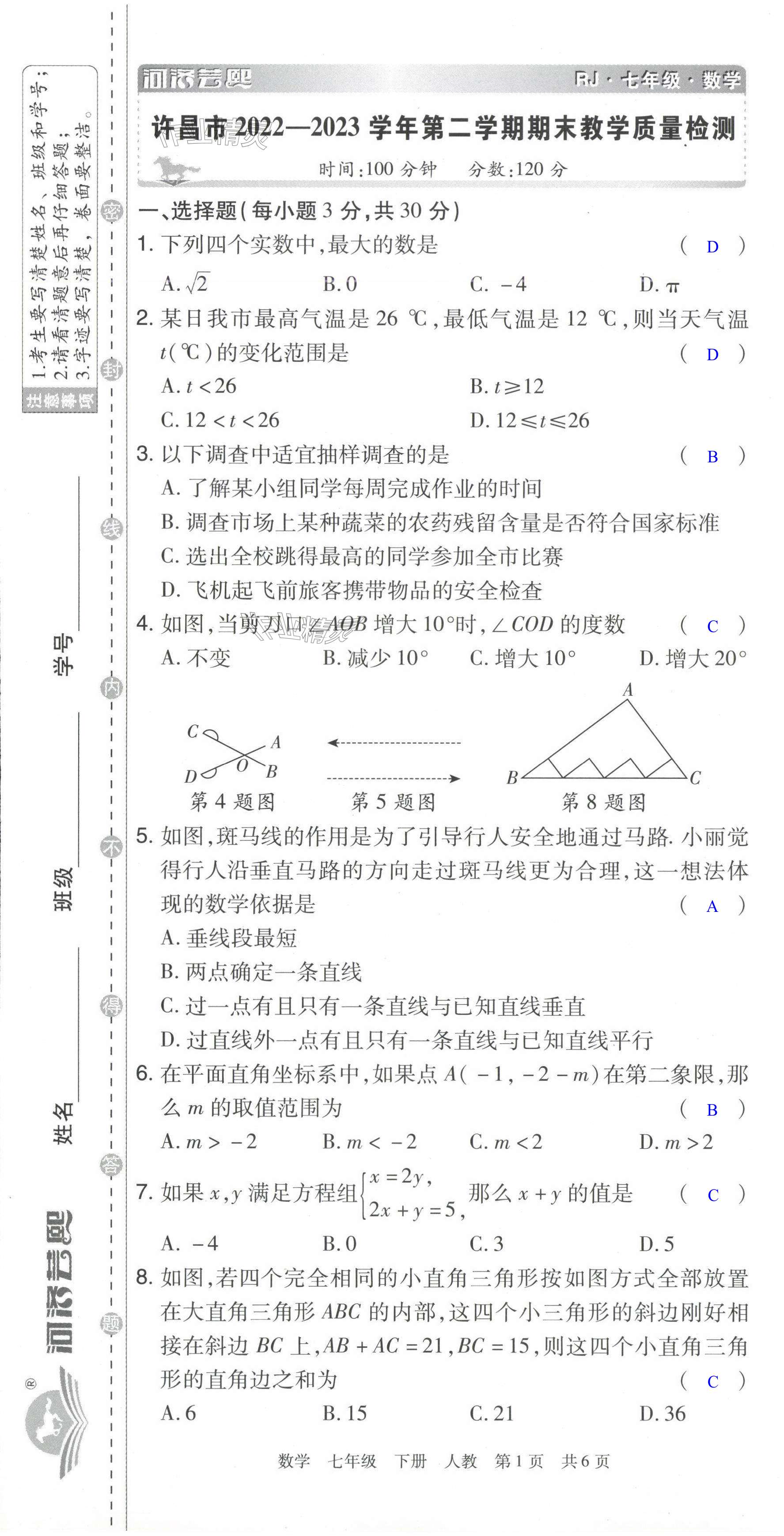 注:目前有些书本章节名称可能整理的还不是很完善,但都是按照顺序排列的,请同学们按照顺序仔细查找。练习册 2024年期末考试必刷卷七年级数学下册人教版河南专版 答案主要是用来给同学们做完题方便对答案用的,请勿直接抄袭。