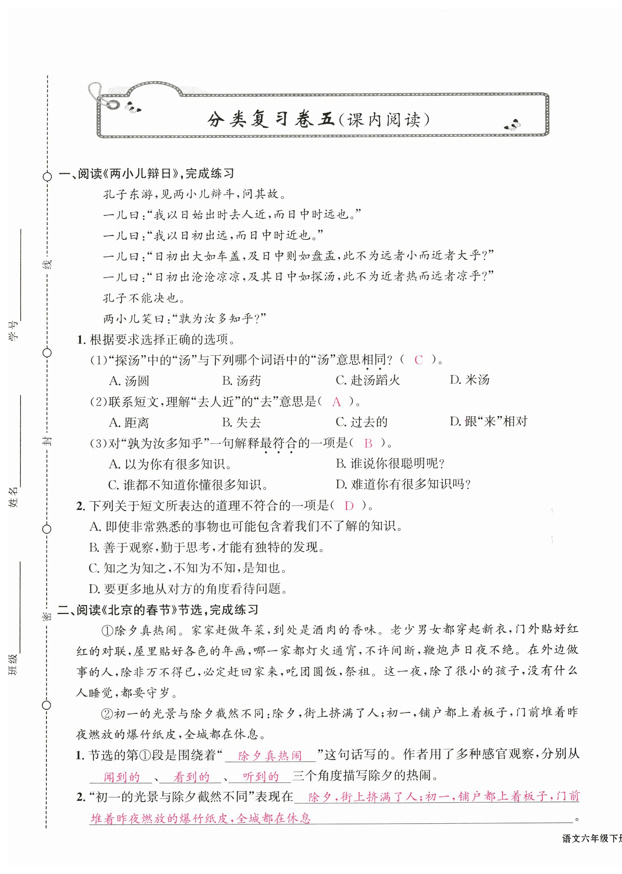 注:目前有些书本章节名称可能整理的还不是很完善,但都是按照顺序排列的,请同学们按照顺序仔细查找。练习册 2024年浙江各地期末迎考卷六年级语文下册人教版 答案主要是用来给同学们做完题方便对答案用的,请勿直接抄袭。