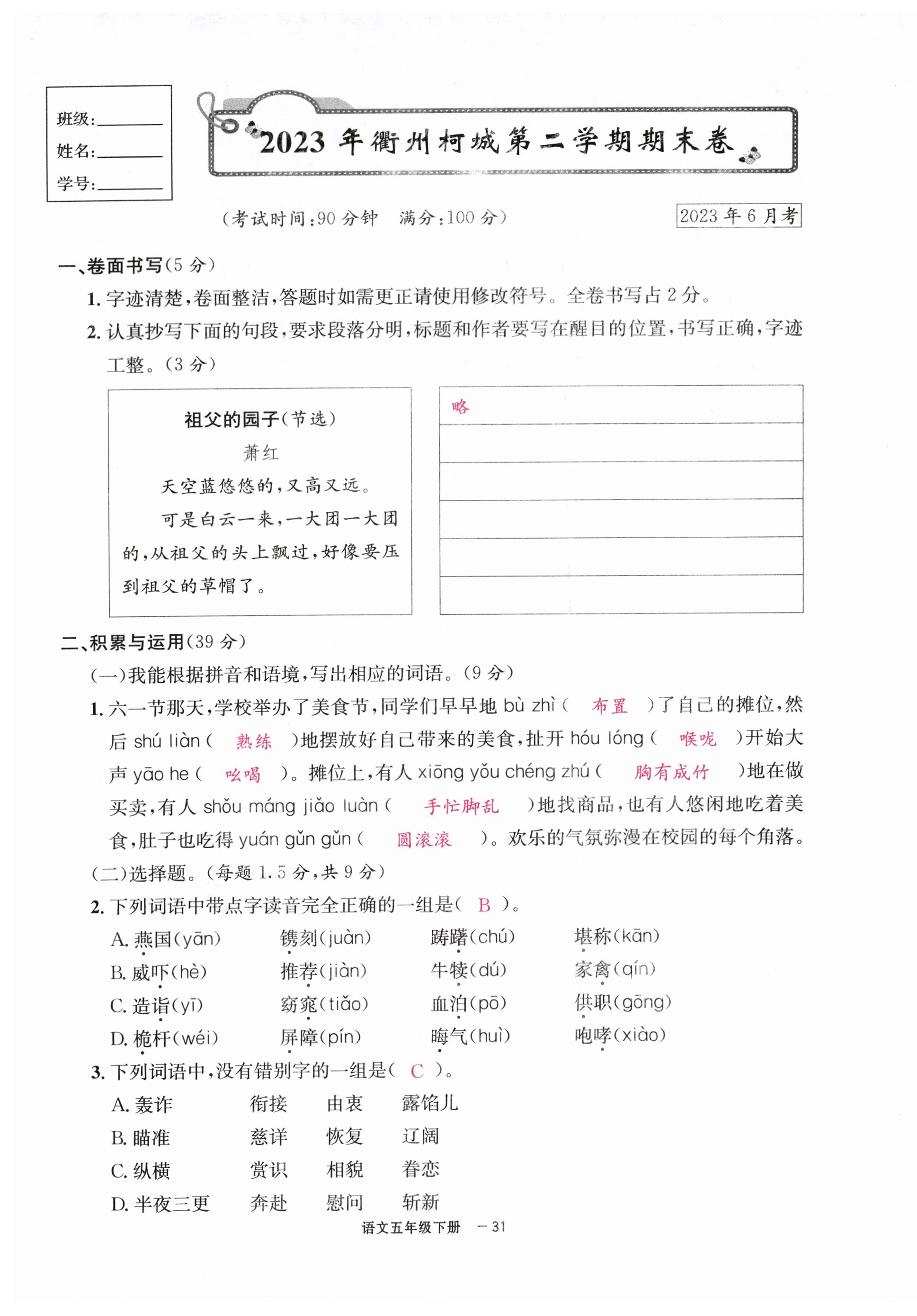 注:目前有些书本章节名称可能整理的还不是很完善,但都是按照顺序排列的,请同学们按照顺序仔细查找。练习册 2024年浙江各地期末迎考卷五年级语文下册人教版 答案主要是用来给同学们做完题方便对答案用的,请勿直接抄袭。