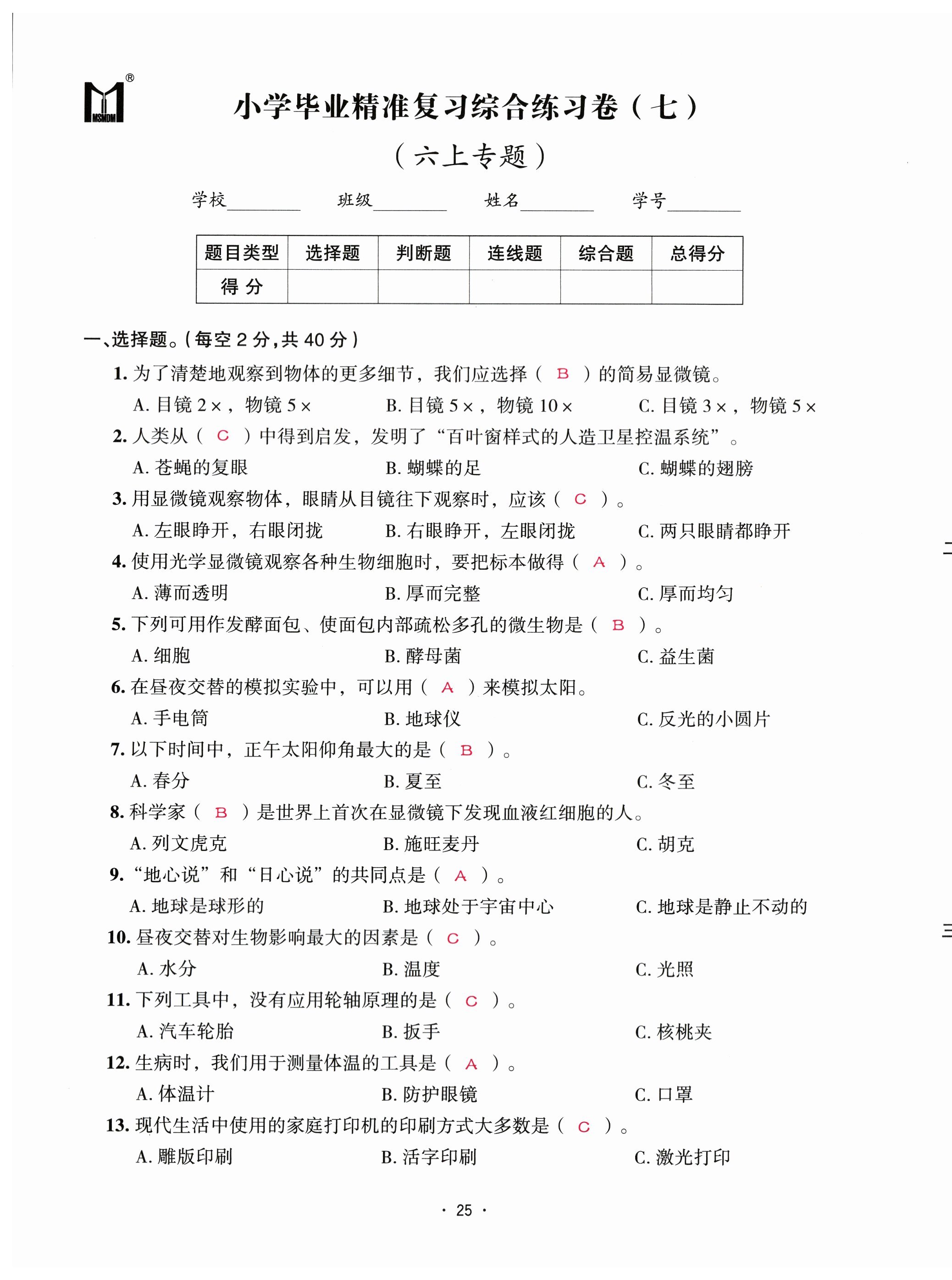 注:目前有些书本章节名称可能整理的还不是很完善,但都是按照顺序排列的,请同学们按照顺序仔细查找。练习册 2024年小考致高点小升初归类冲刺卷六年级科学 答案主要是用来给同学们做完题方便对答案用的,请勿直接抄袭。