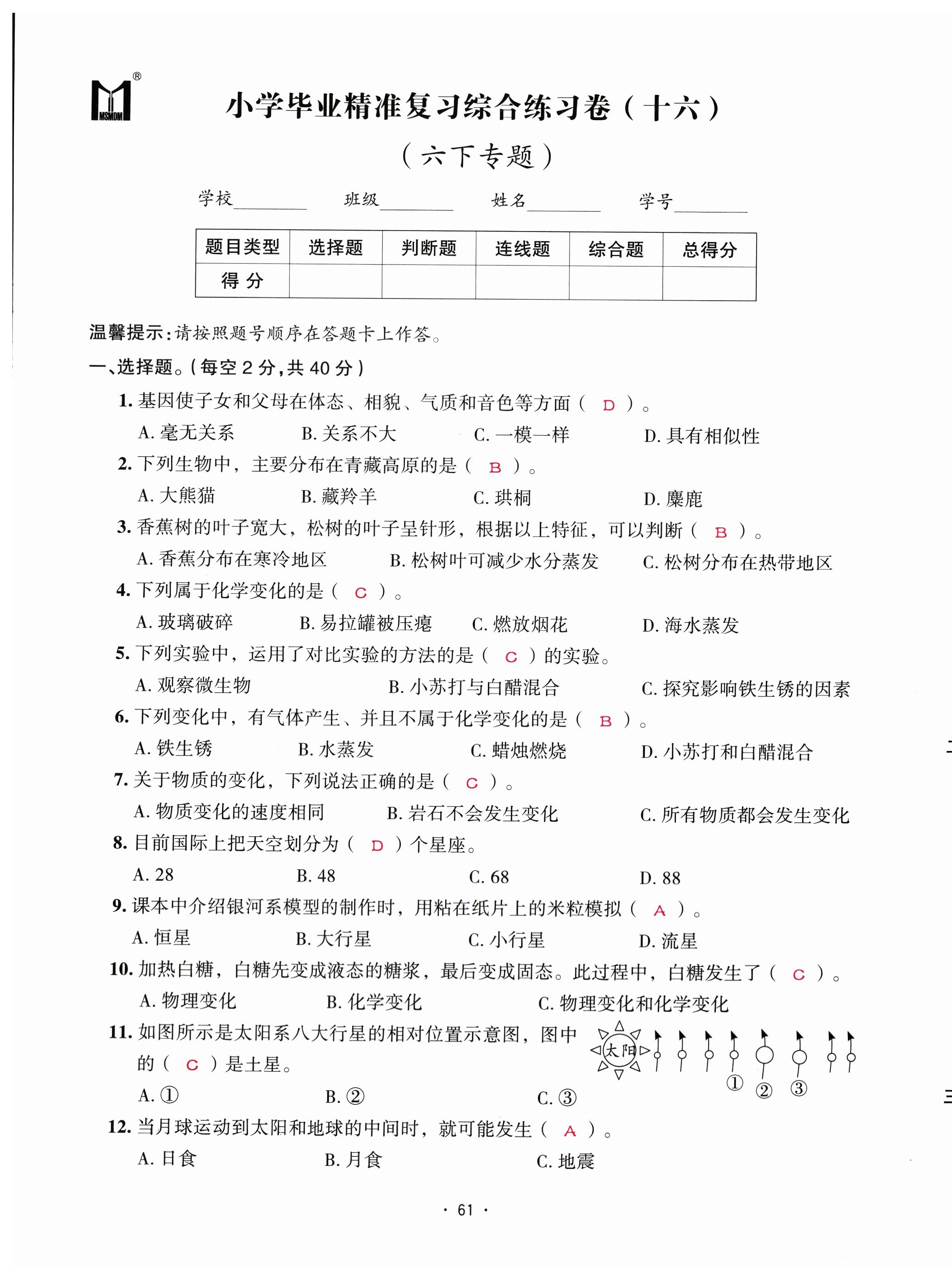 注:目前有些书本章节名称可能整理的还不是很完善,但都是按照顺序排列的,请同学们按照顺序仔细查找。练习册 2024年小考致高点小升初归类冲刺卷六年级科学 答案主要是用来给同学们做完题方便对答案用的,请勿直接抄袭。