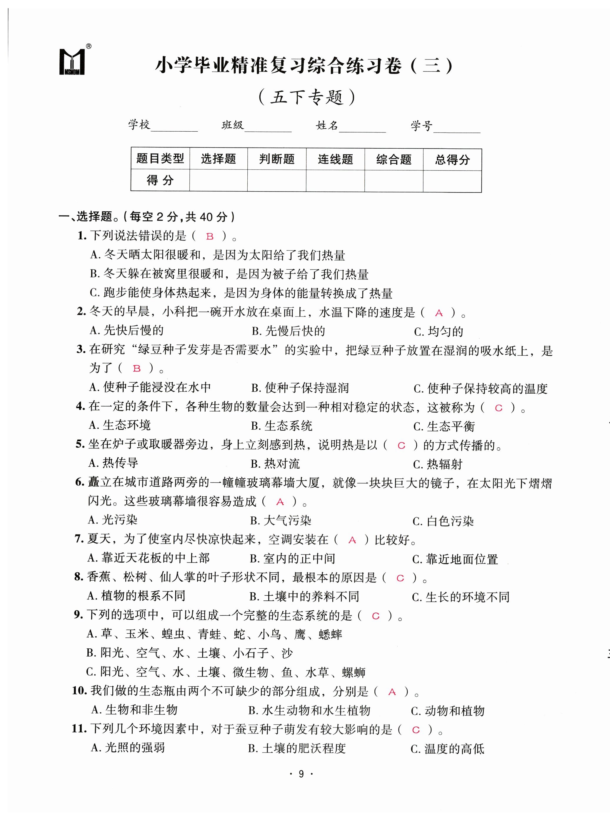 注:目前有些书本章节名称可能整理的还不是很完善,但都是按照顺序排列的,请同学们按照顺序仔细查找。练习册 2024年小考致高点小升初归类冲刺卷六年级科学 答案主要是用来给同学们做完题方便对答案用的,请勿直接抄袭。