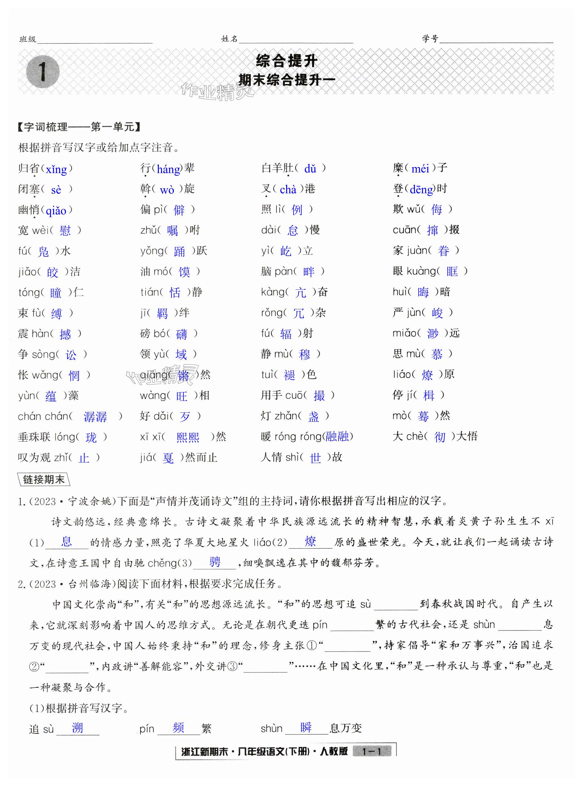 注:目前有些书本章节名称可能整理的还不是很完善,但都是按照顺序排列的,请同学们按照顺序仔细查找。练习册 2024年励耘书业浙江新期末八年级语文下册人教版 答案主要是用来给同学们做完题方便对答案用的,请勿直接抄袭。