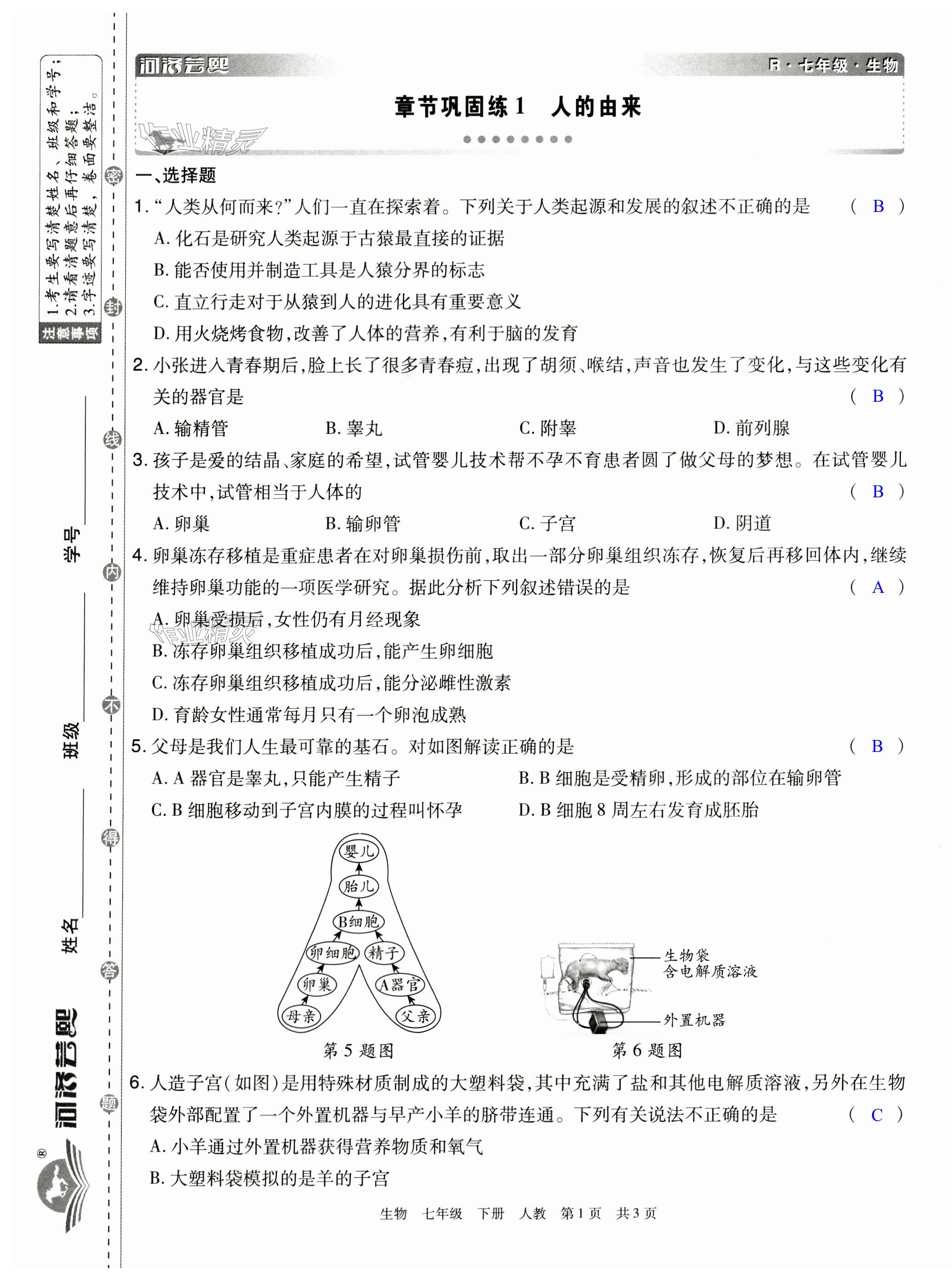 注:目前有些书本章节名称可能整理的还不是很完善,但都是按照顺序排列的,请同学们按照顺序仔细查找。练习册 2024年期末考试必刷卷七年级生物下册人教版郑州专版 答案主要是用来给同学们做完题方便对答案用的,请勿直接抄袭。