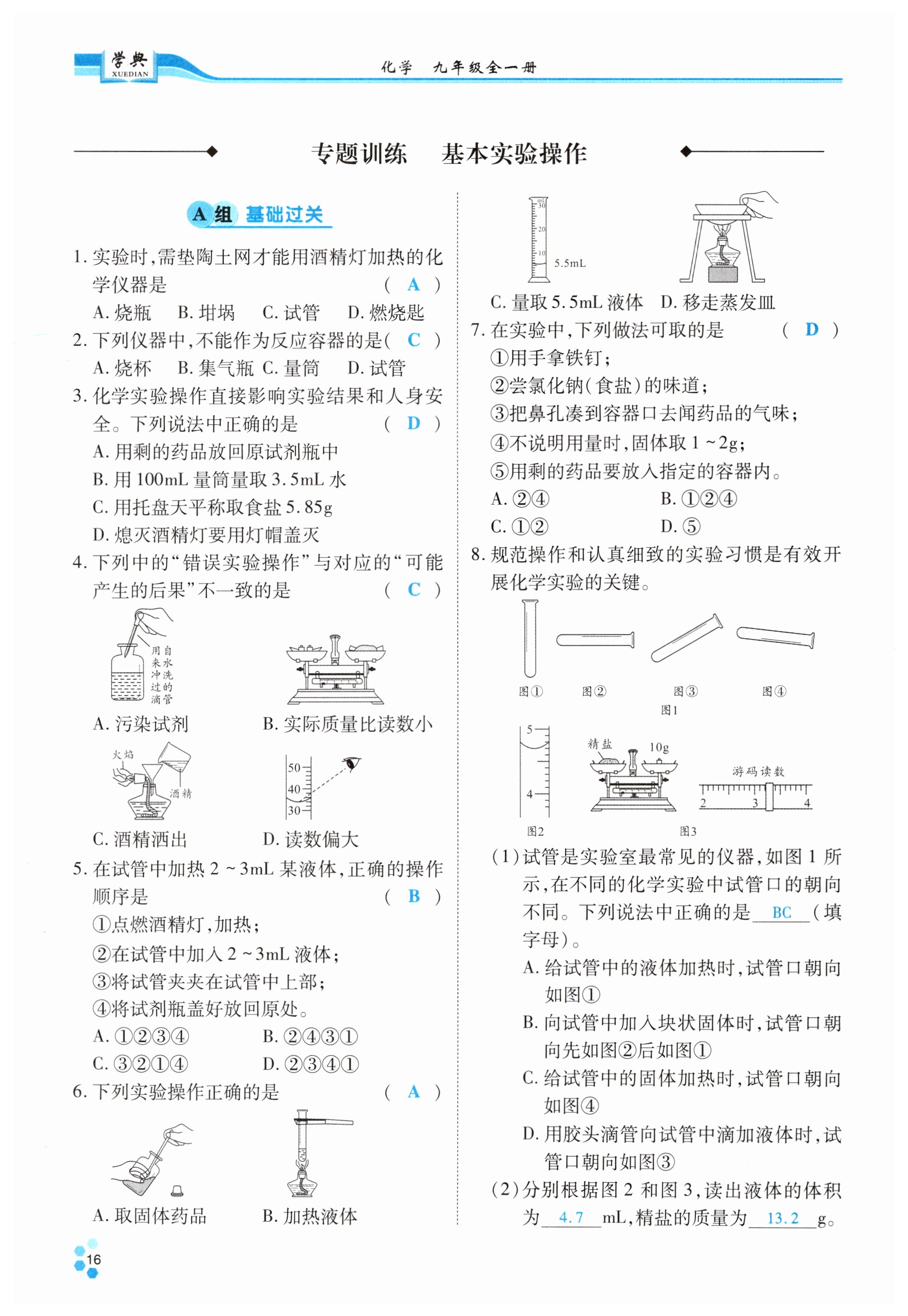 注:目前有些书本章节名称可能整理的还不是很完善,但都是按照顺序排列的,请同学们按照顺序仔细查找。练习册 2024年学典四川九年级化学全一册人教版 答案主要是用来给同学们做完题方便对答案用的,请勿直接抄袭。