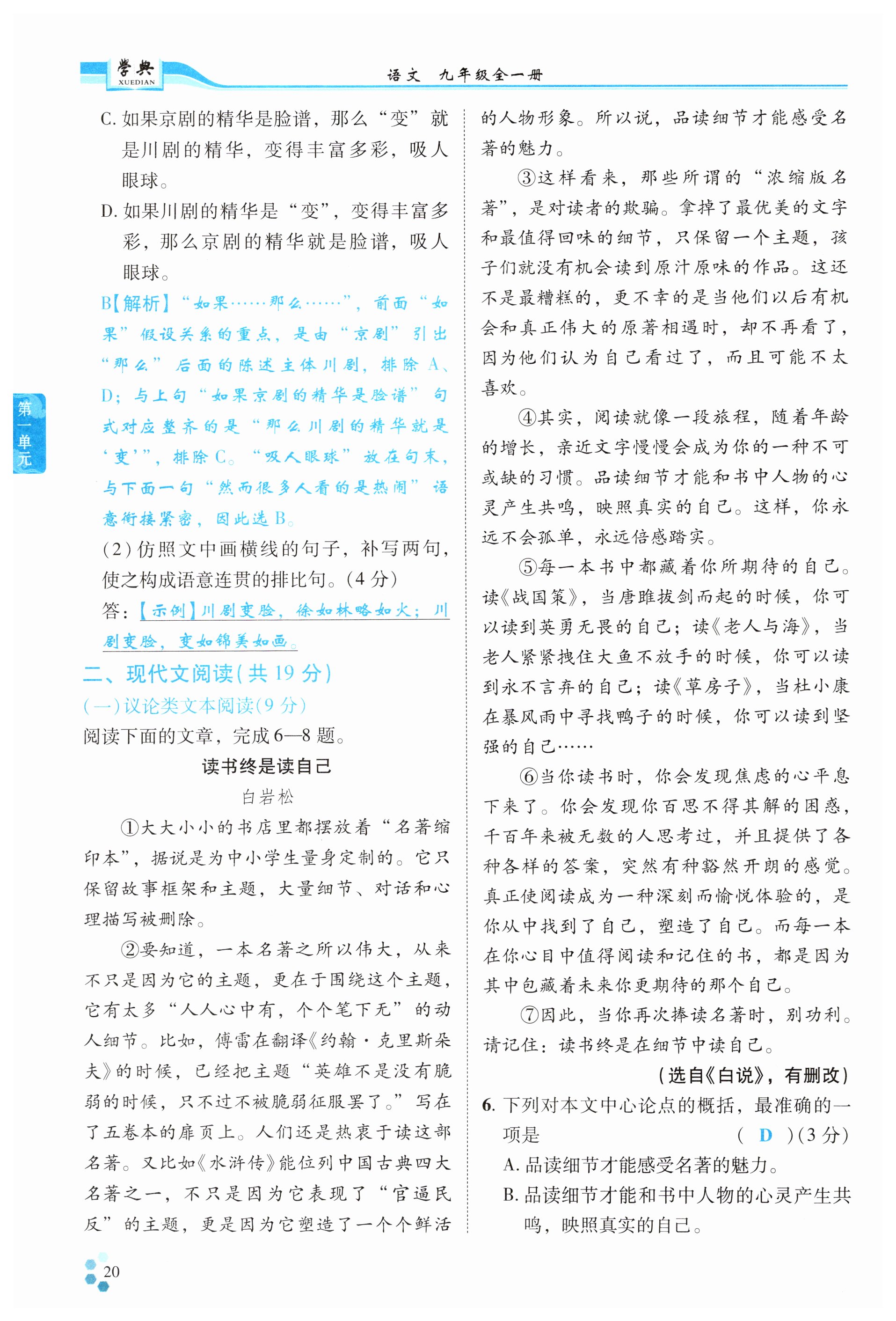 注:目前有些书本章节名称可能整理的还不是很完善,但都是按照顺序排列的,请同学们按照顺序仔细查找。练习册 2024年学典四川九年级语文全一册人教版 答案主要是用来给同学们做完题方便对答案用的,请勿直接抄袭。
