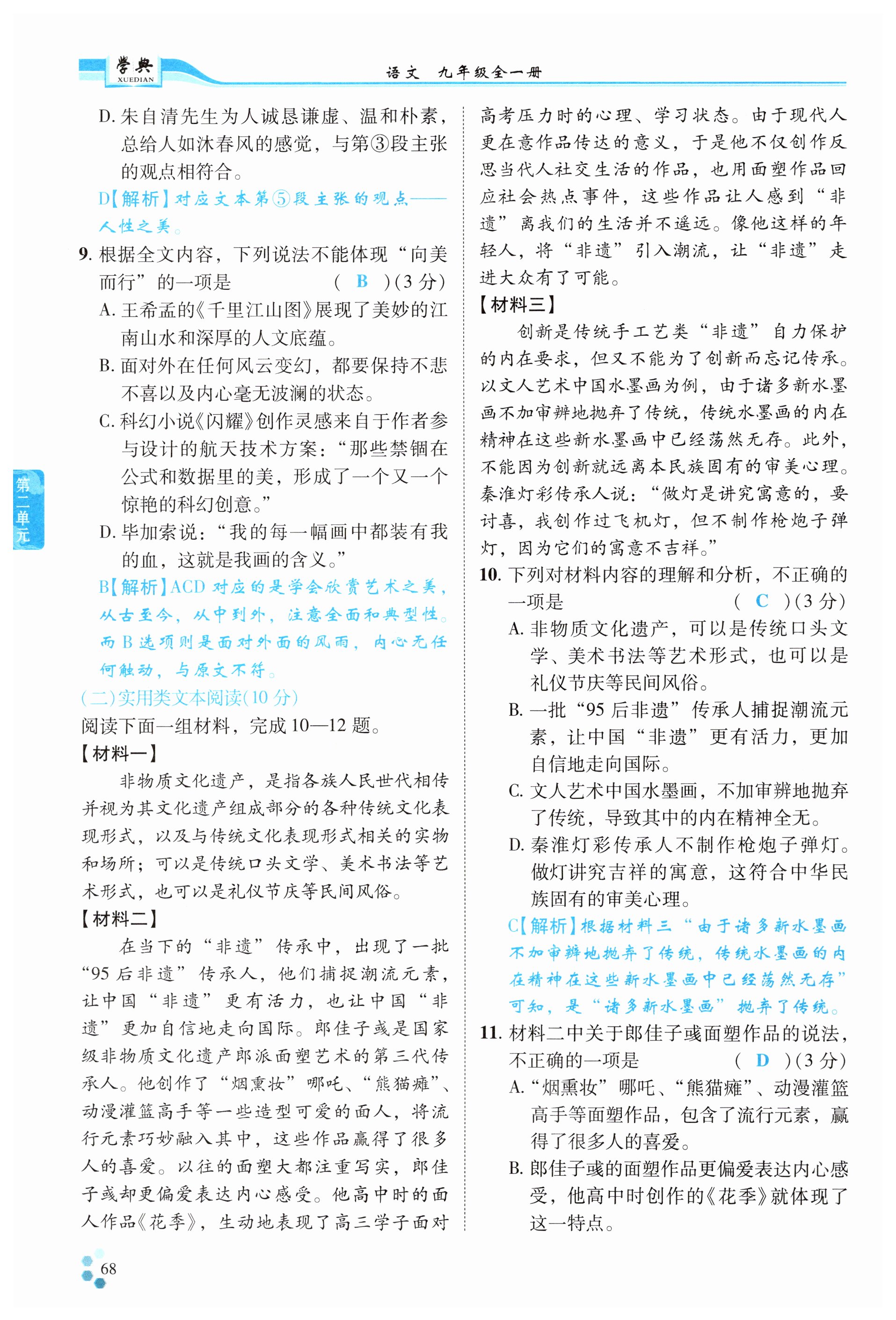 注:目前有些书本章节名称可能整理的还不是很完善,但都是按照顺序排列的,请同学们按照顺序仔细查找。练习册 2024年学典四川九年级语文全一册人教版 答案主要是用来给同学们做完题方便对答案用的,请勿直接抄袭。