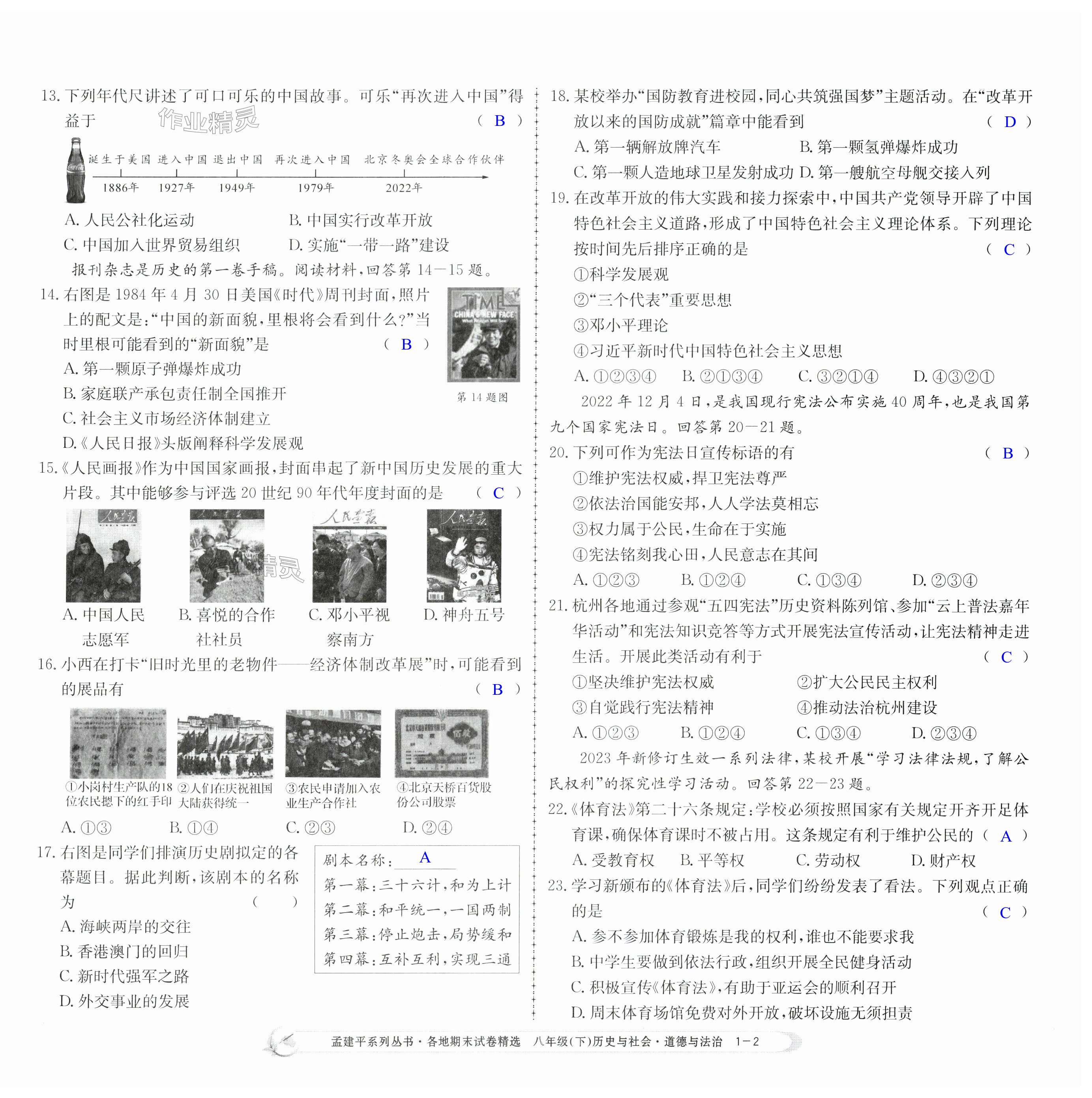 注:目前有些书本章节名称可能整理的还不是很完善,但都是按照顺序排列的,请同学们按照顺序仔细查找。练习册 2024年孟建平各地期末试卷精选八年级历史与社会道德与法治下册人教版 答案主要是用来给同学们做完题方便对答案用的,请勿直接抄袭。
