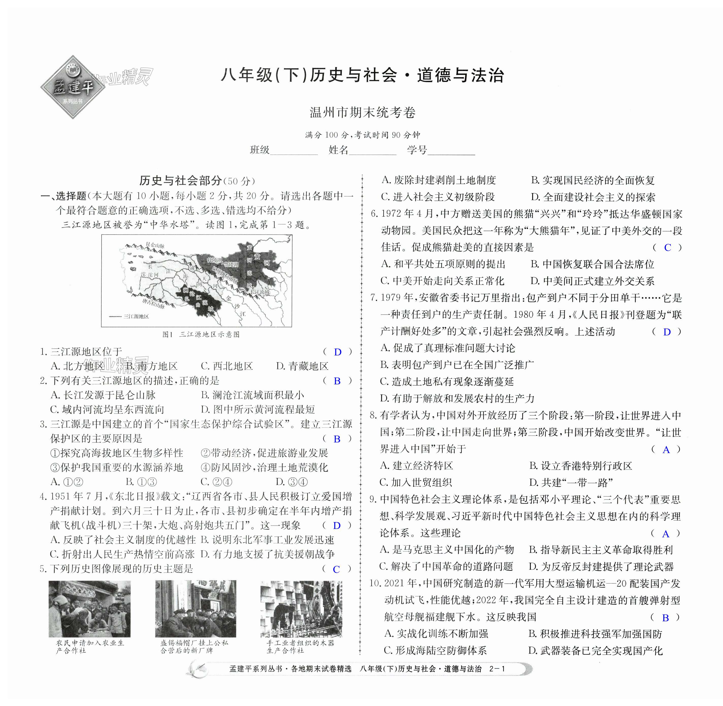 注:目前有些书本章节名称可能整理的还不是很完善,但都是按照顺序排列的,请同学们按照顺序仔细查找。练习册 2024年孟建平各地期末试卷精选八年级历史与社会道德与法治下册人教版 答案主要是用来给同学们做完题方便对答案用的,请勿直接抄袭。