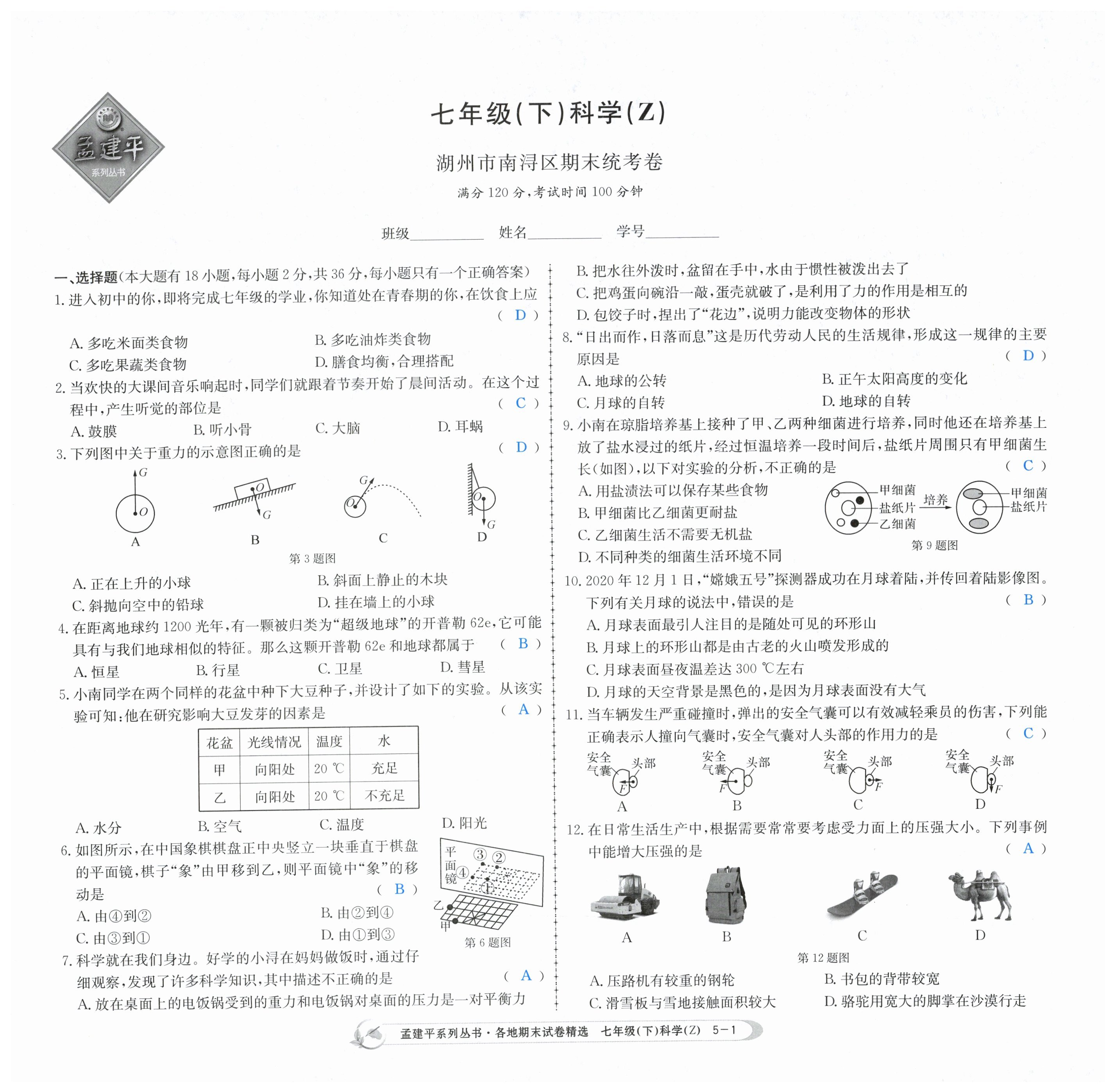 2024年孟建平各地期末试卷精选七年级科学下册浙教版