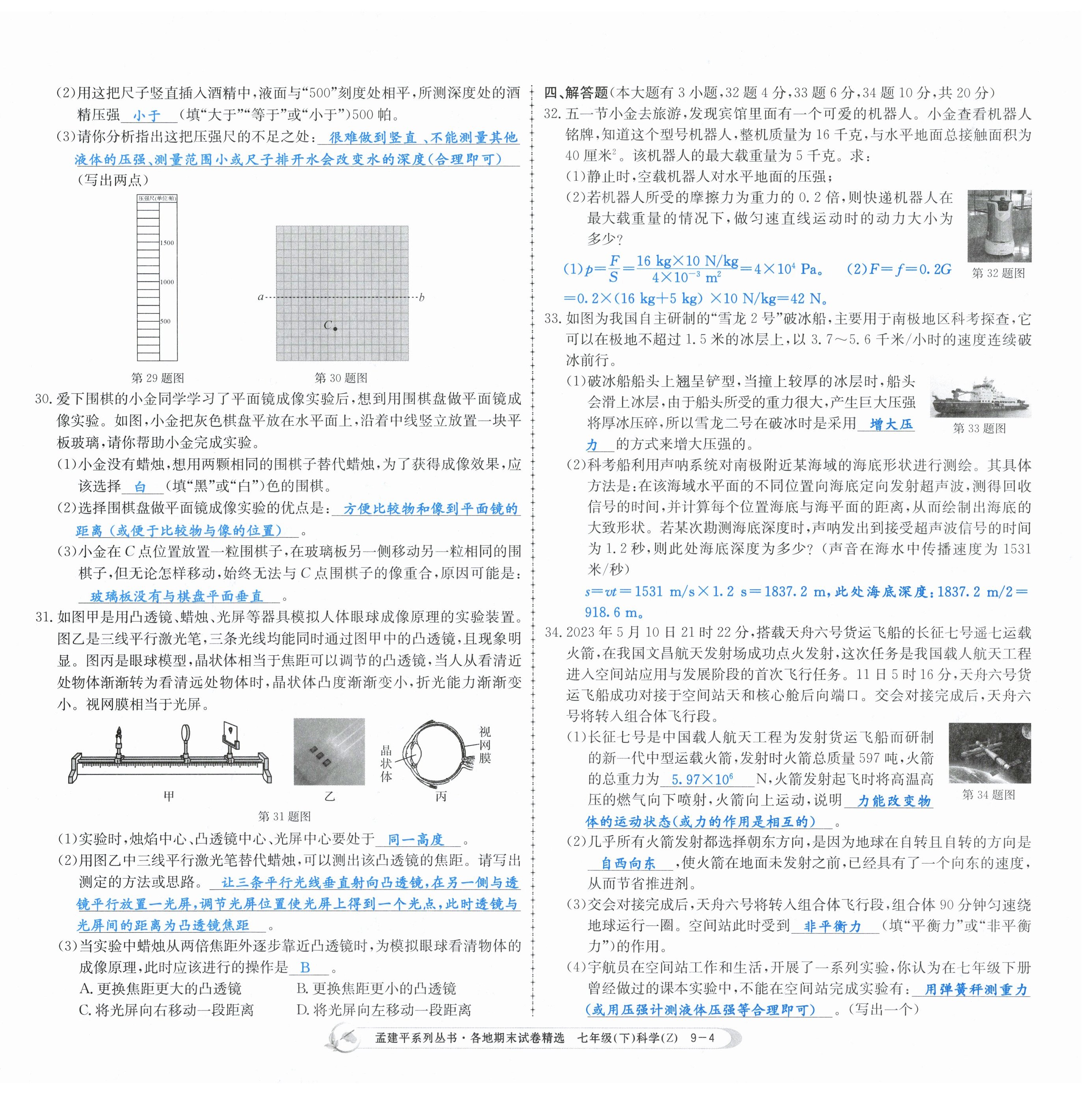 2024年孟建平各地期末试卷精选七年级科学下册浙教版