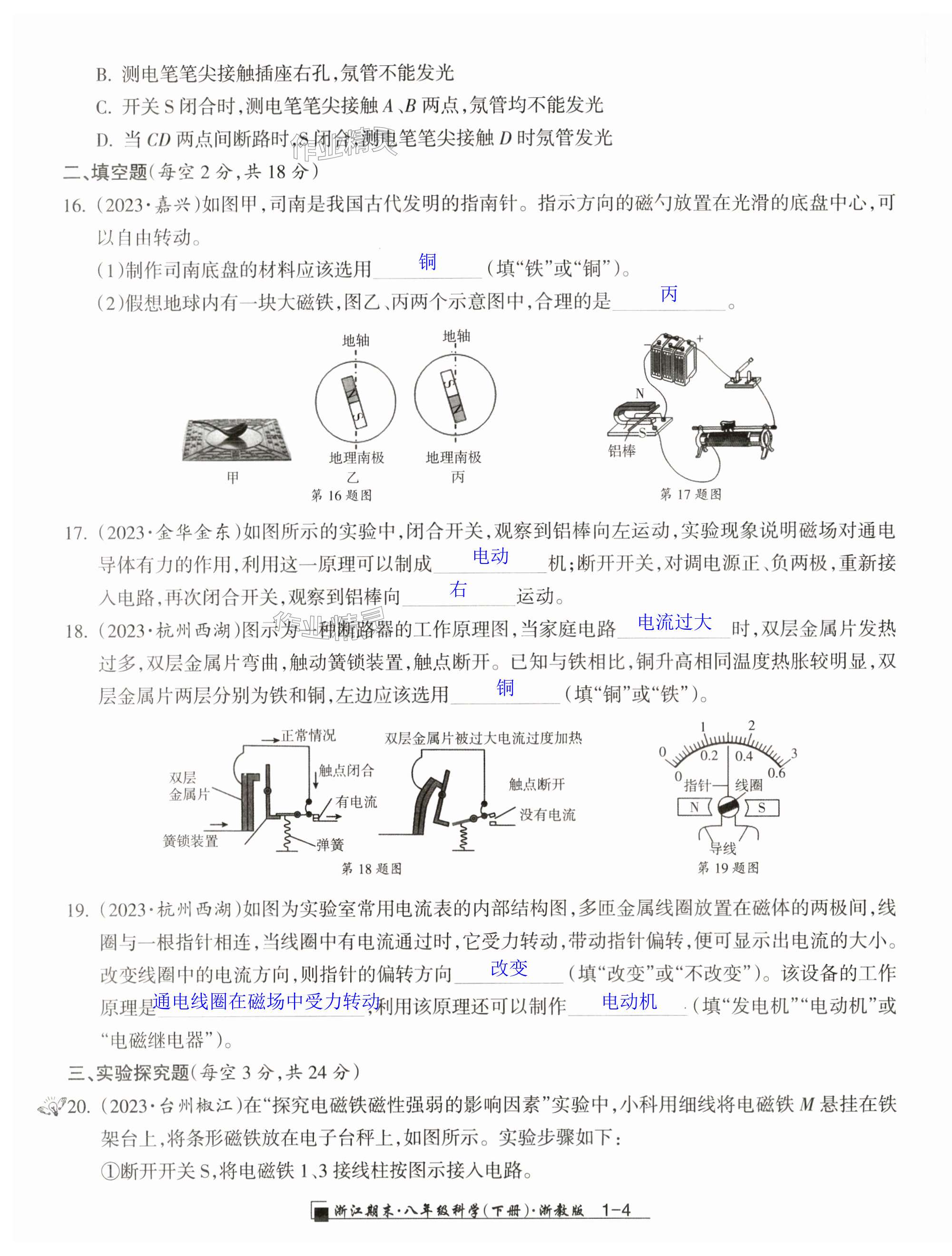 注:目前有些书本章节名称可能整理的还不是很完善,但都是按照顺序排列的,请同学们按照顺序仔细查找。练习册 2024年励耘书业浙江期末八年级科学下册浙教版 答案主要是用来给同学们做完题方便对答案用的,请勿直接抄袭。
