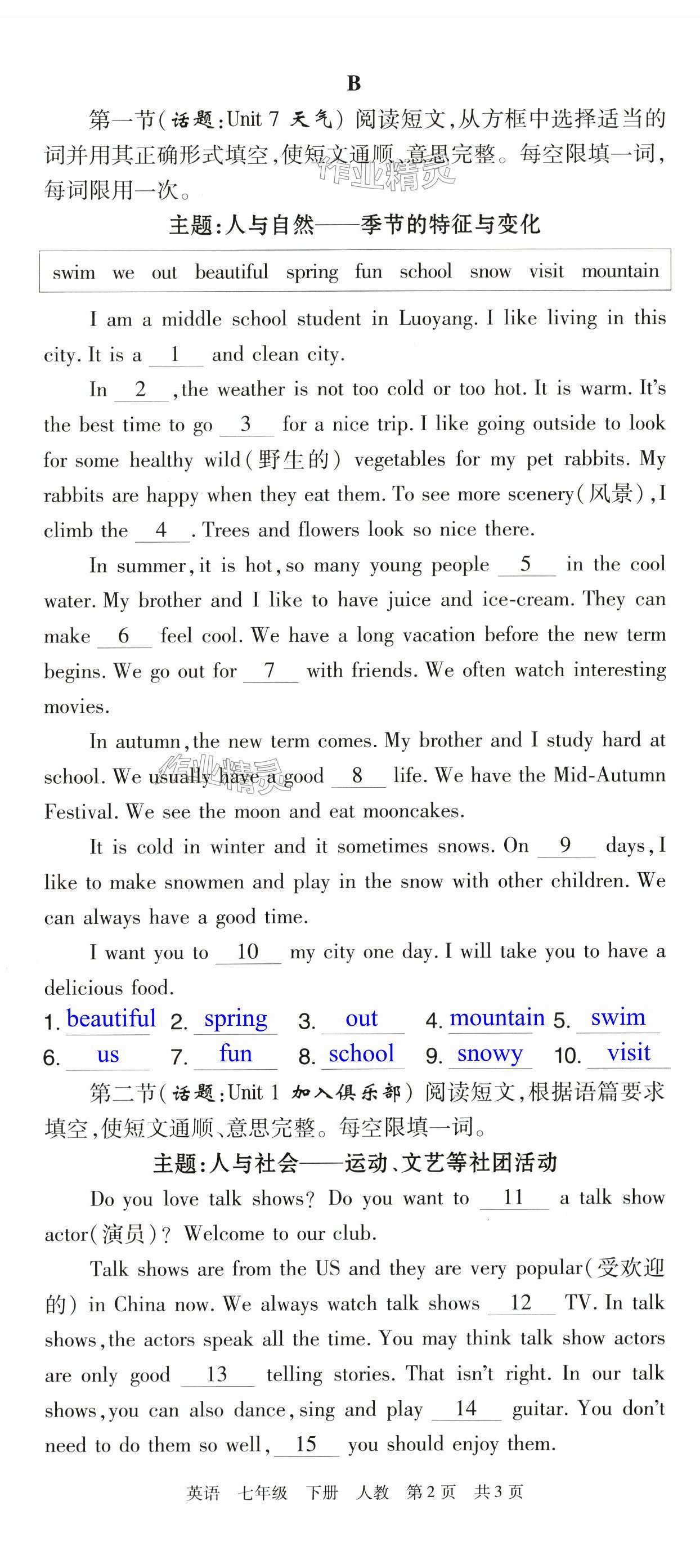 注:目前有些书本章节名称可能整理的还不是很完善,但都是按照顺序排列的,请同学们按照顺序仔细查找。练习册 2024年期末考试必刷卷七年级英语下册人教版河南专版 答案主要是用来给同学们做完题方便对答案用的,请勿直接抄袭。