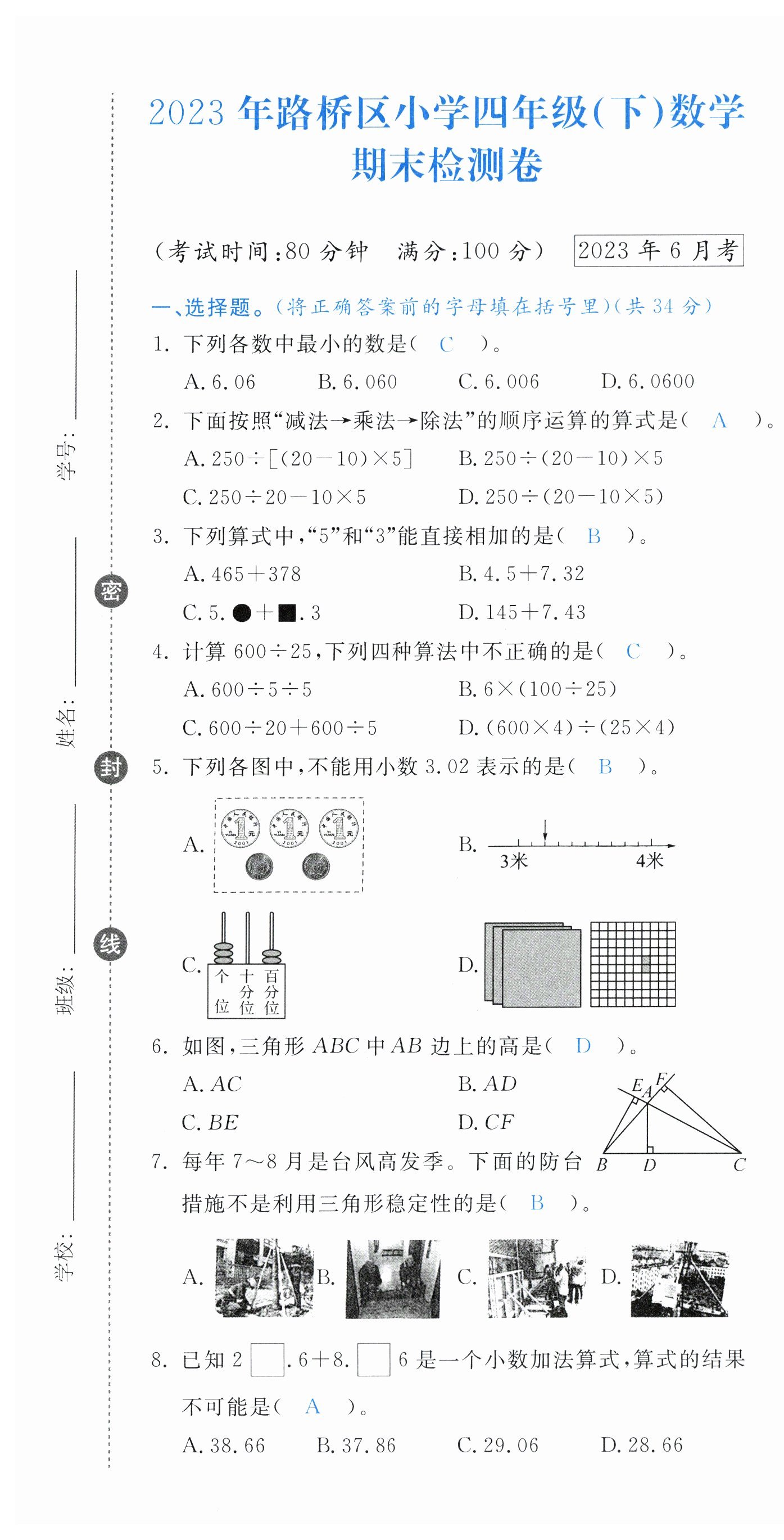 注:目前有些书本章节名称可能整理的还不是很完善,但都是按照顺序排列的,请同学们按照顺序仔细查找。练习册 2024年小学期末加油站四年级数学下册人教版 答案主要是用来给同学们做完题方便对答案用的,请勿直接抄袭。