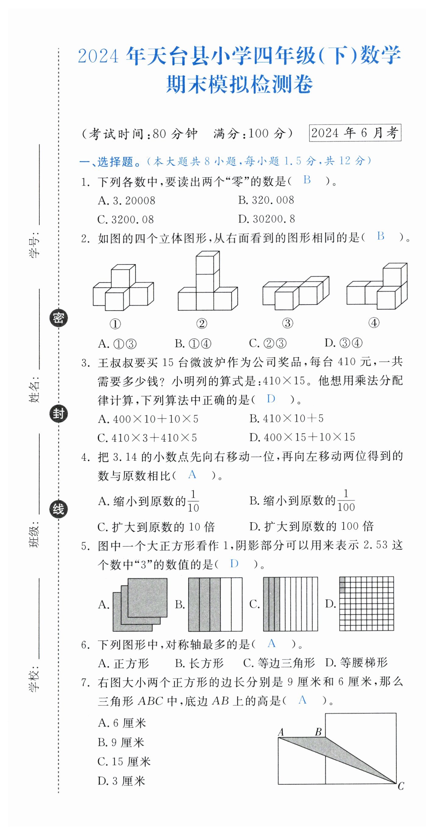 注:目前有些书本章节名称可能整理的还不是很完善,但都是按照顺序排列的,请同学们按照顺序仔细查找。练习册 2024年小学期末加油站四年级数学下册人教版 答案主要是用来给同学们做完题方便对答案用的,请勿直接抄袭。