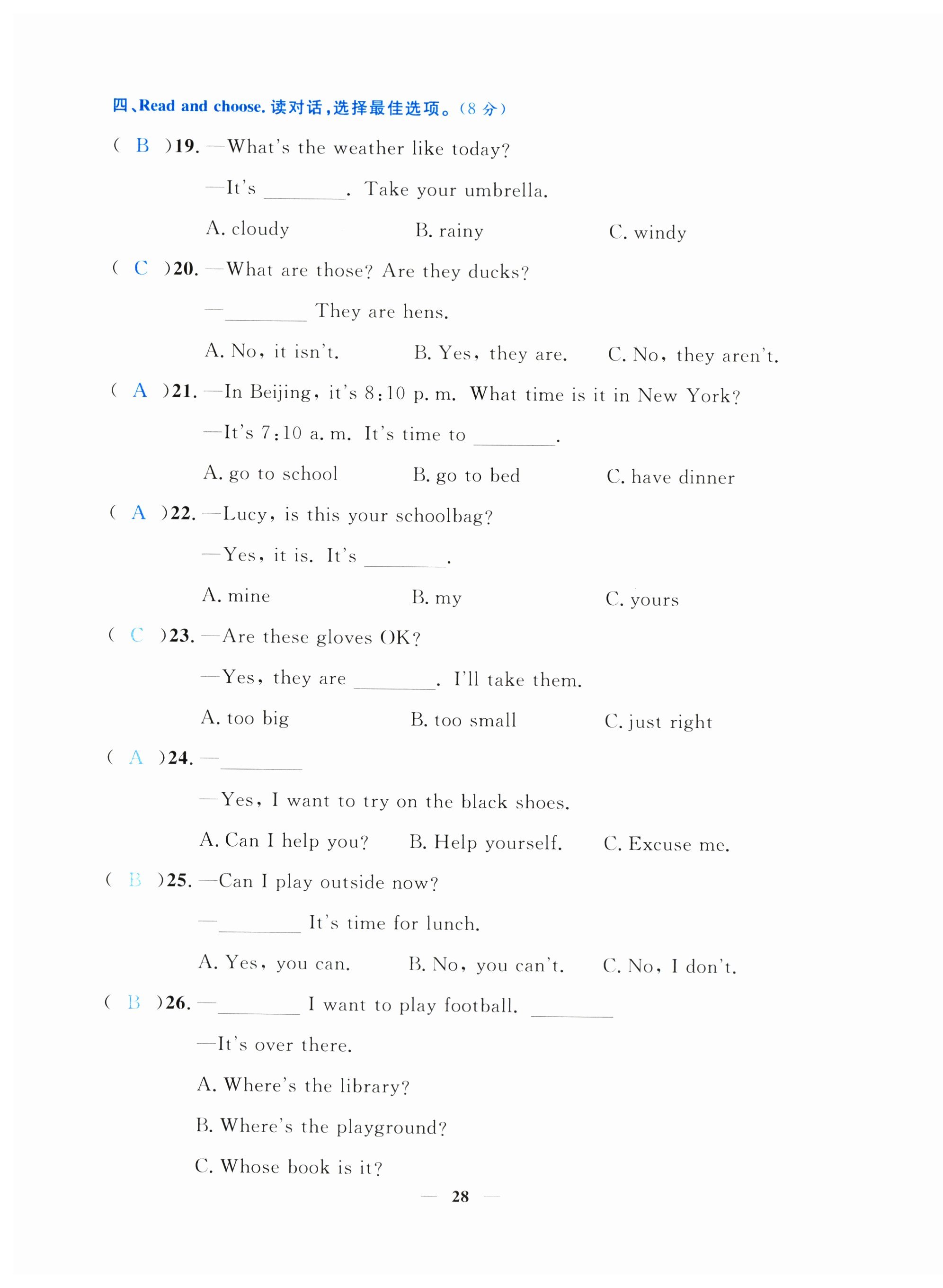 注:目前有些书本章节名称可能整理的还不是很完善,但都是按照顺序排列的,请同学们按照顺序仔细查找。练习册 2024年小学期末加油站四年级英语下册人教版 答案主要是用来给同学们做完题方便对答案用的,请勿直接抄袭。