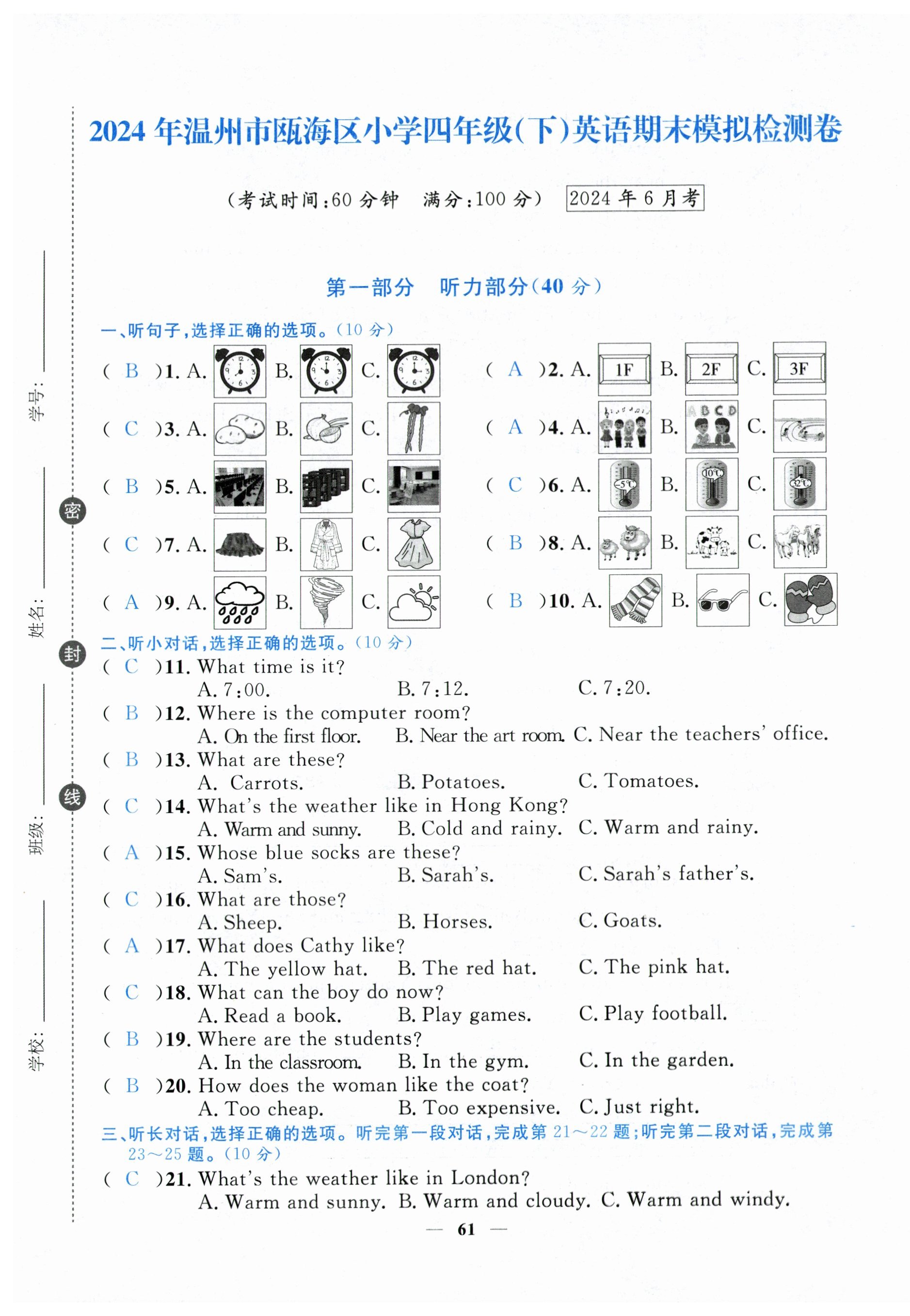 注:目前有些书本章节名称可能整理的还不是很完善,但都是按照顺序排列的,请同学们按照顺序仔细查找。练习册 2024年小学期末加油站四年级英语下册人教版 答案主要是用来给同学们做完题方便对答案用的,请勿直接抄袭。