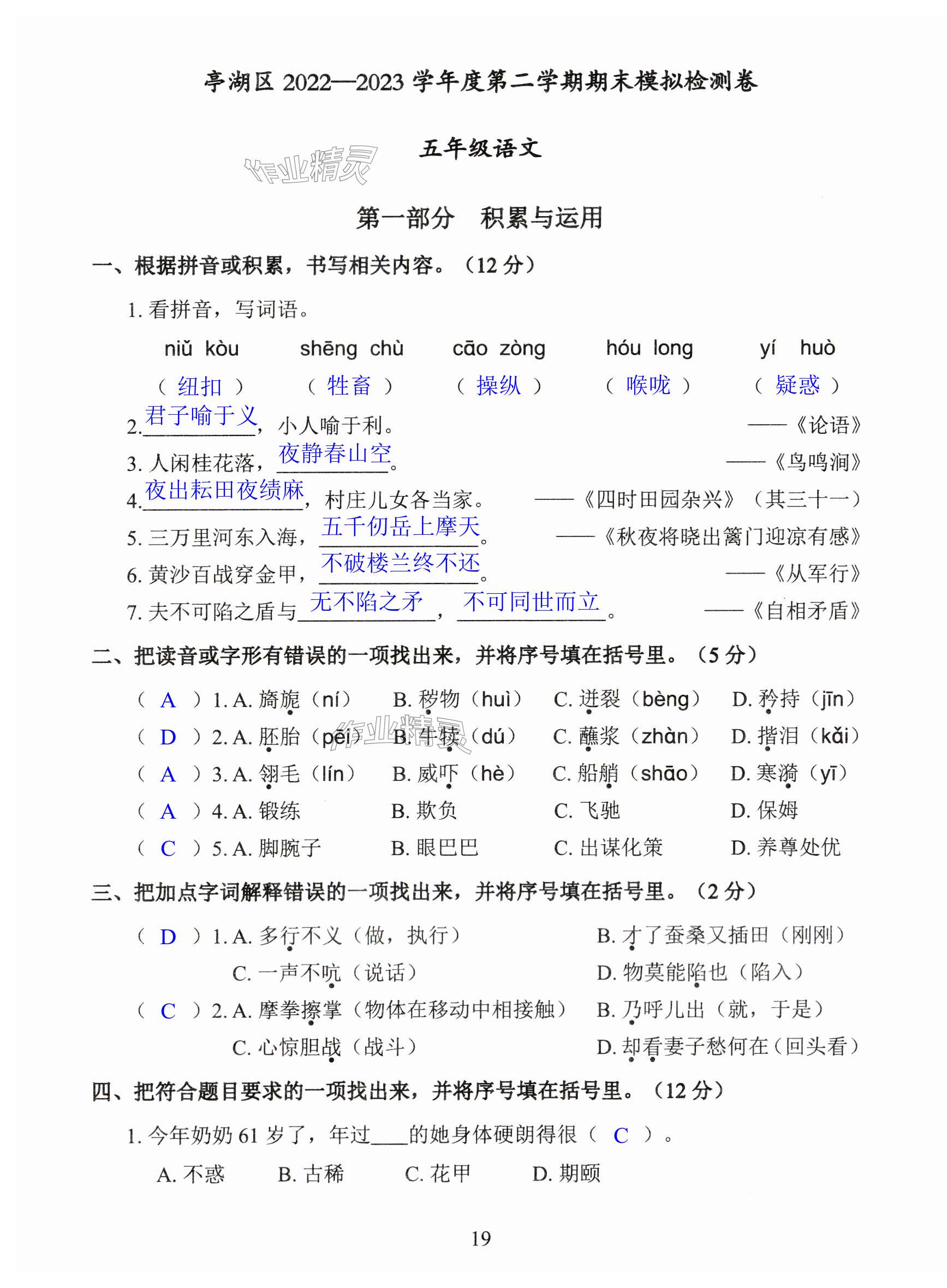 注:目前有些书本章节名称可能整理的还不是很完善,但都是按照顺序排列的,请同学们按照顺序仔细查找。练习册 2024年小学期末试卷汇编北京出版社五年级语文下册人教版 答案主要是用来给同学们做完题方便对答案用的,请勿直接抄袭。