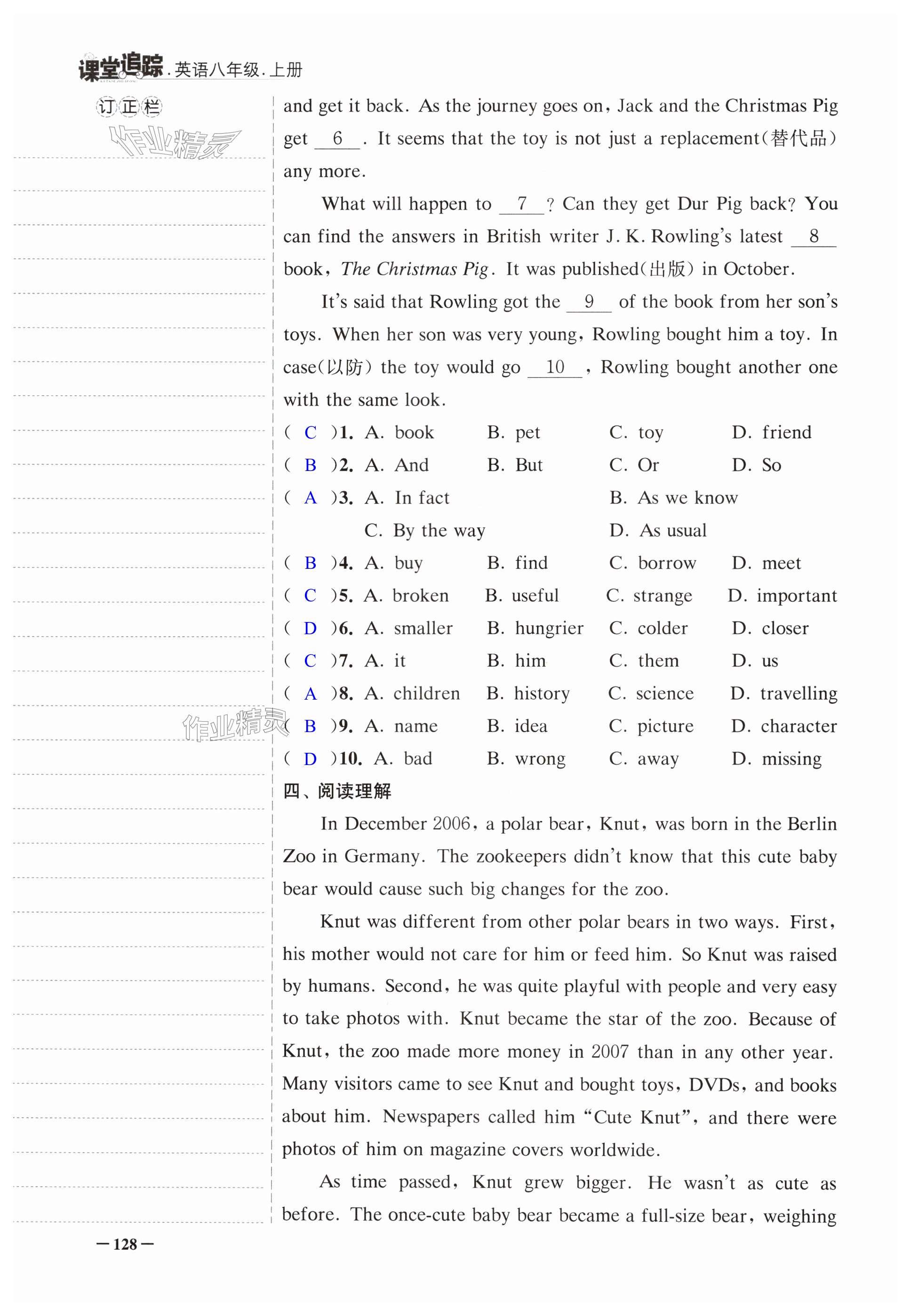 注:目前有些书本章节名称可能整理的还不是很完善,但都是按照顺序排列的,请同学们按照顺序仔细查找。练习册 2024年课堂追踪八年级英语上册译林版 答案主要是用来给同学们做完题方便对答案用的,请勿直接抄袭。