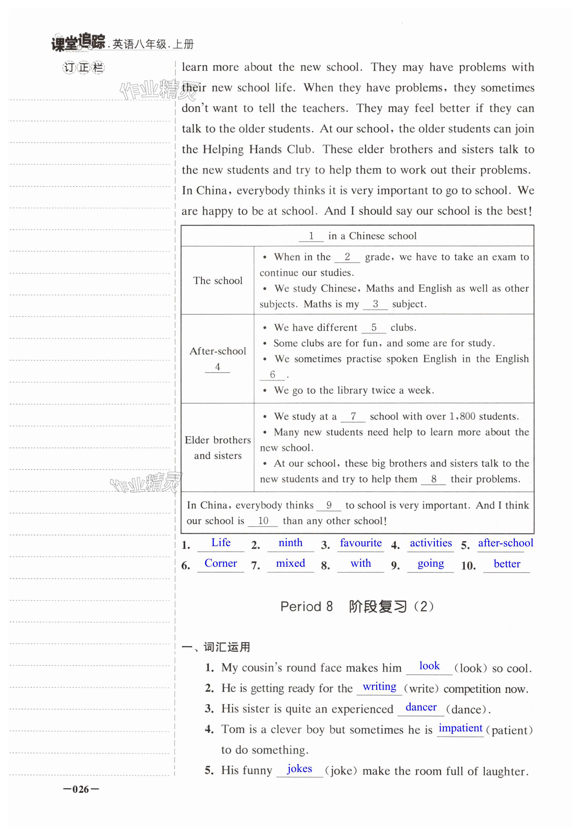 注:目前有些书本章节名称可能整理的还不是很完善,但都是按照顺序排列的,请同学们按照顺序仔细查找。练习册 2024年课堂追踪八年级英语上册译林版 答案主要是用来给同学们做完题方便对答案用的,请勿直接抄袭。