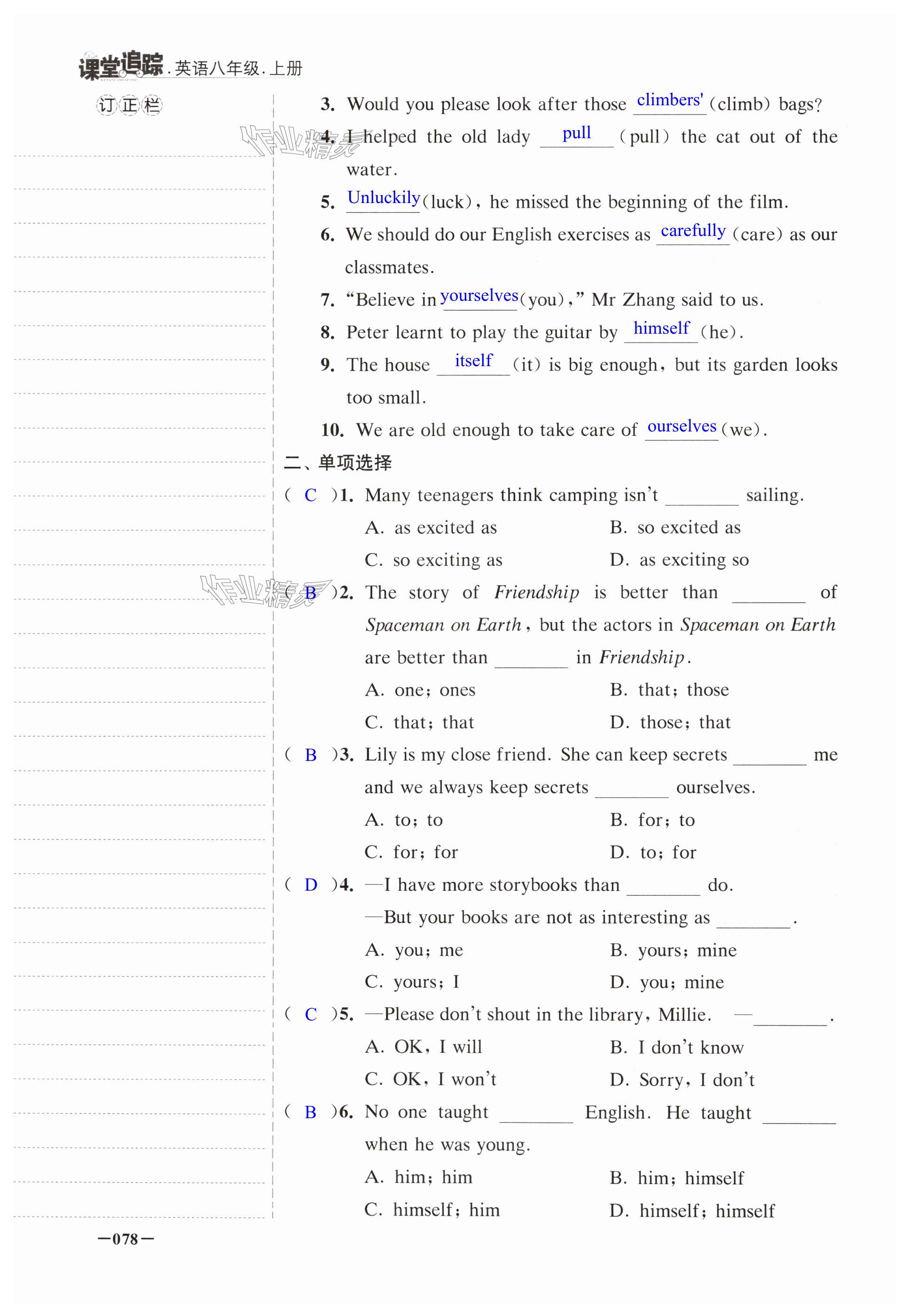 注:目前有些书本章节名称可能整理的还不是很完善,但都是按照顺序排列的,请同学们按照顺序仔细查找。练习册 2024年课堂追踪八年级英语上册译林版 答案主要是用来给同学们做完题方便对答案用的,请勿直接抄袭。