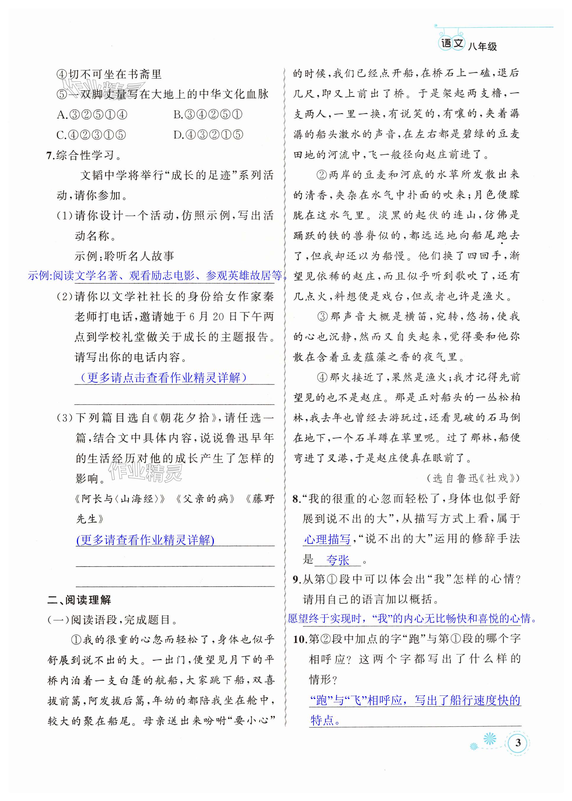 注:目前有些书本章节名称可能整理的还不是很完善,但都是按照顺序排列的,请同学们按照顺序仔细查找。练习册 2024年暑假作业八年级语文新疆青少年出版社 答案主要是用来给同学们做完题方便对答案用的,请勿直接抄袭。