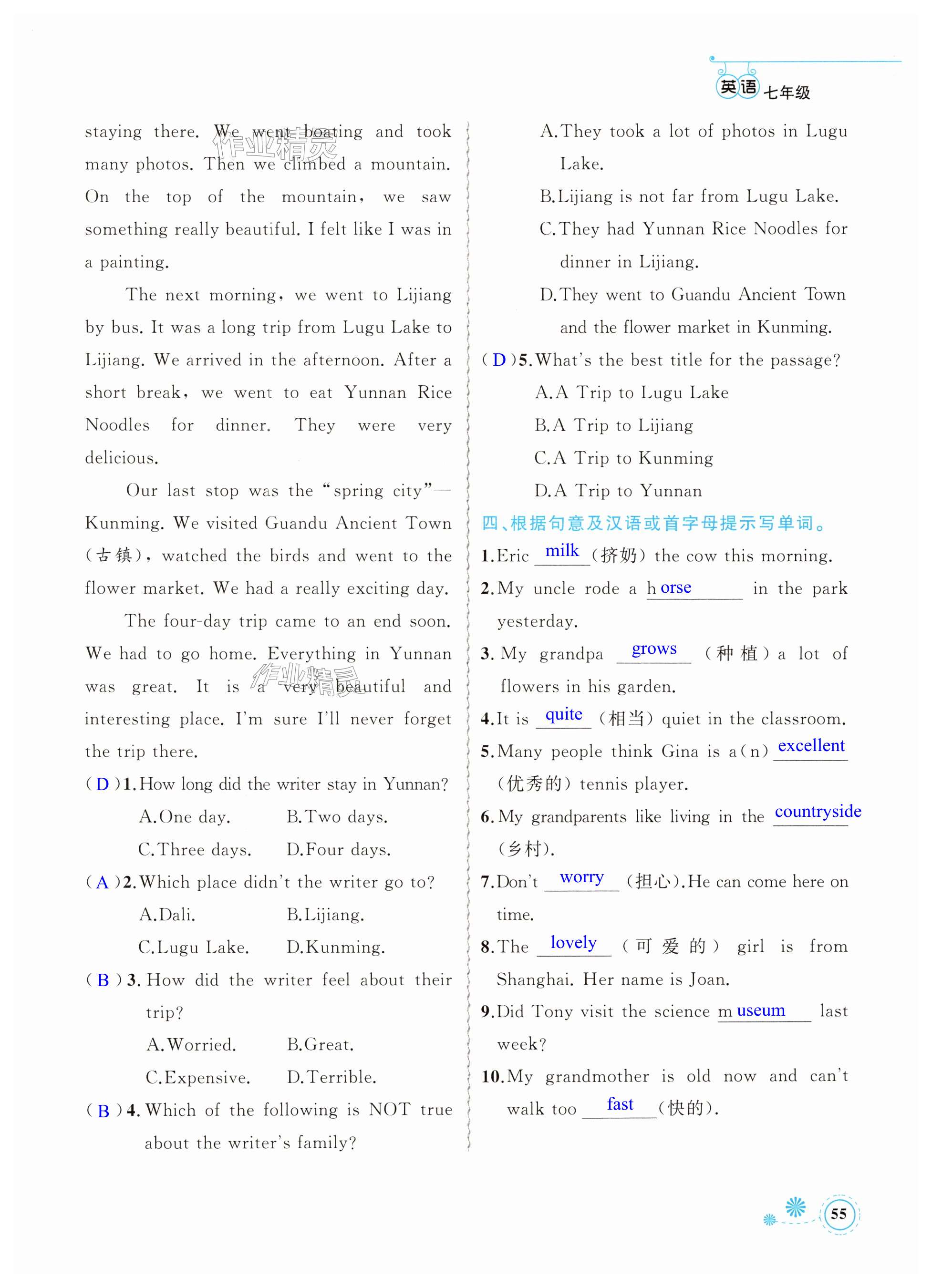 注:目前有些书本章节名称可能整理的还不是很完善,但都是按照顺序排列的,请同学们按照顺序仔细查找。练习册 2024年暑假作业七年级英语新疆青少年出版社 答案主要是用来给同学们做完题方便对答案用的,请勿直接抄袭。
