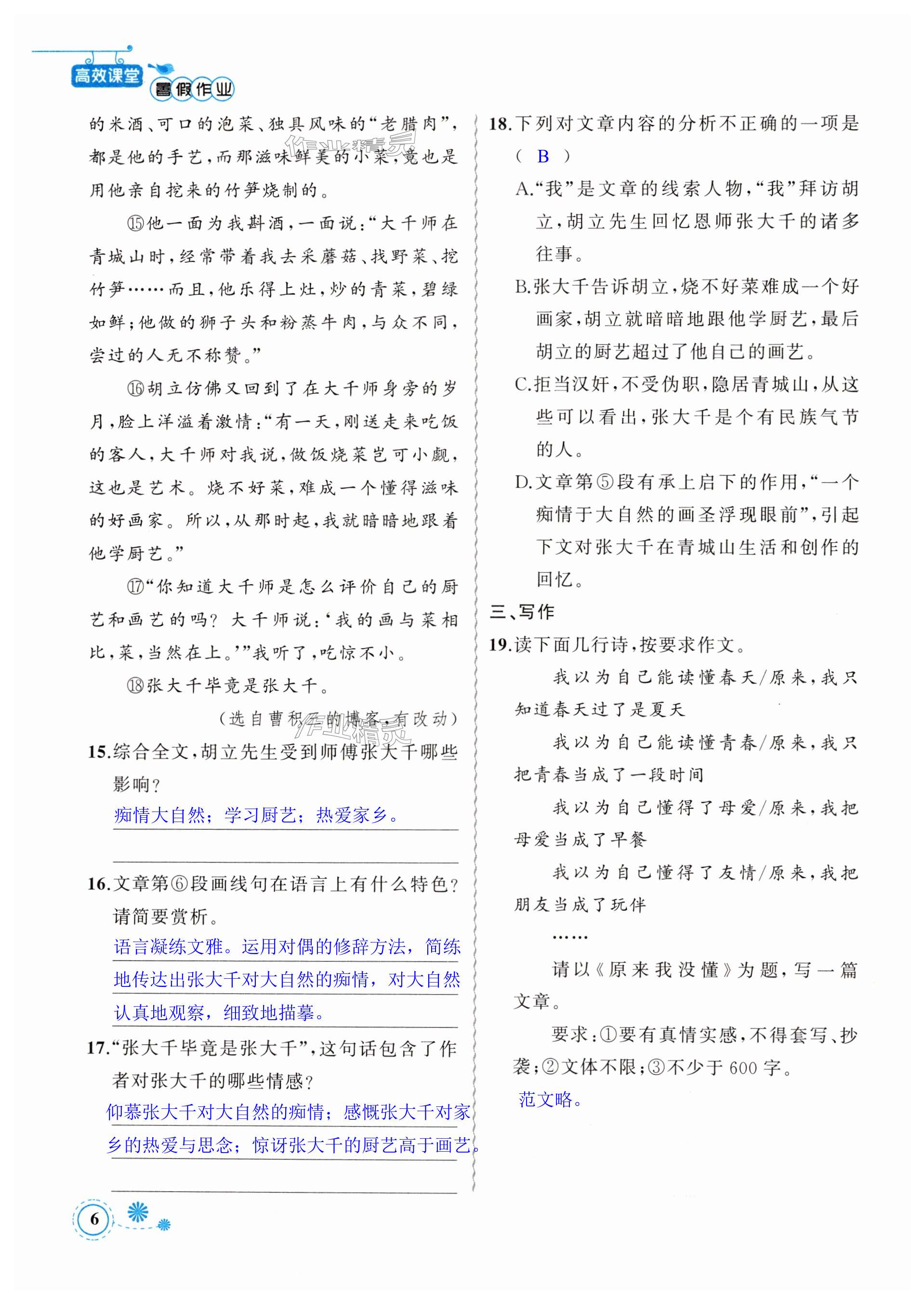 注:目前有些书本章节名称可能整理的还不是很完善,但都是按照顺序排列的,请同学们按照顺序仔细查找。练习册 2024年暑假作业七年级语文新疆青少年出版社 答案主要是用来给同学们做完题方便对答案用的,请勿直接抄袭。