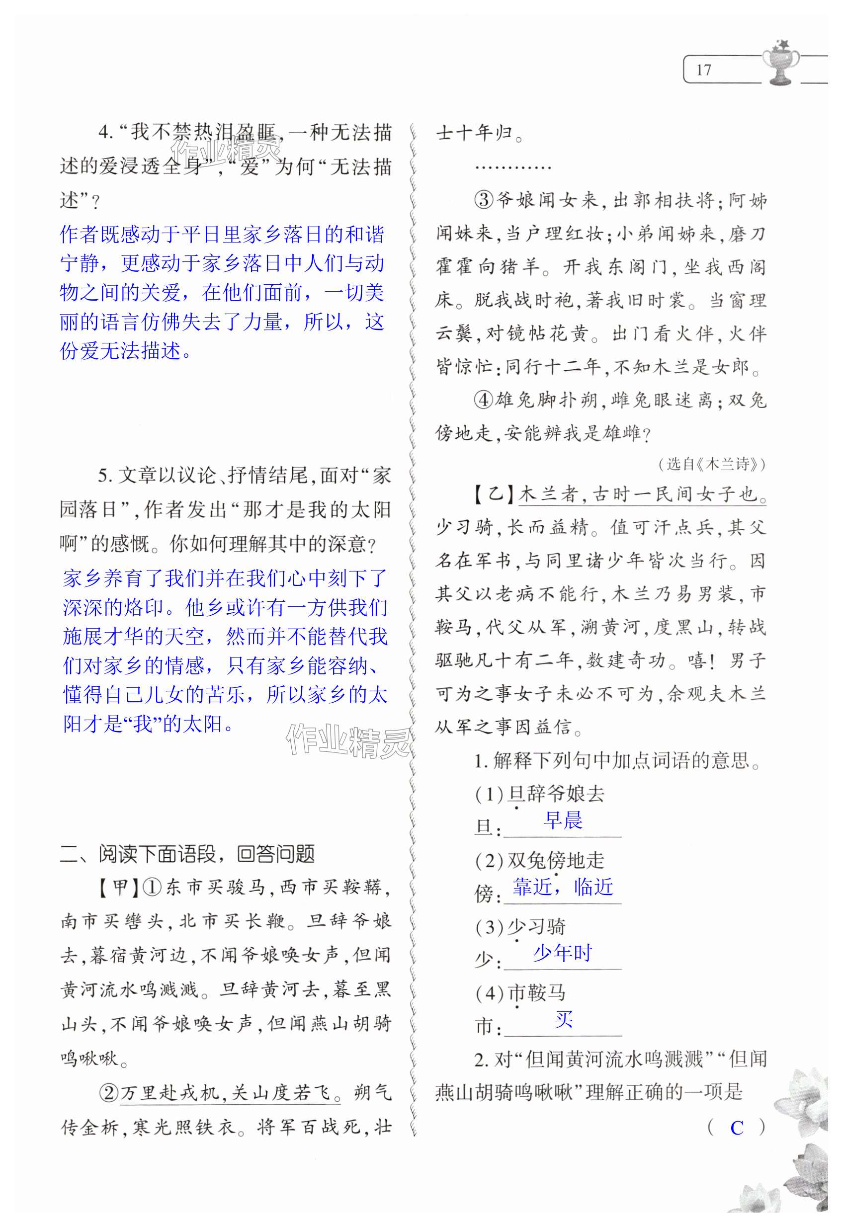 注:目前有些书本章节名称可能整理的还不是很完善,但都是按照顺序排列的,请同学们按照顺序仔细查找。练习册 2024年暑假作业本大象出版社七年级语文人教版 答案主要是用来给同学们做完题方便对答案用的,请勿直接抄袭。