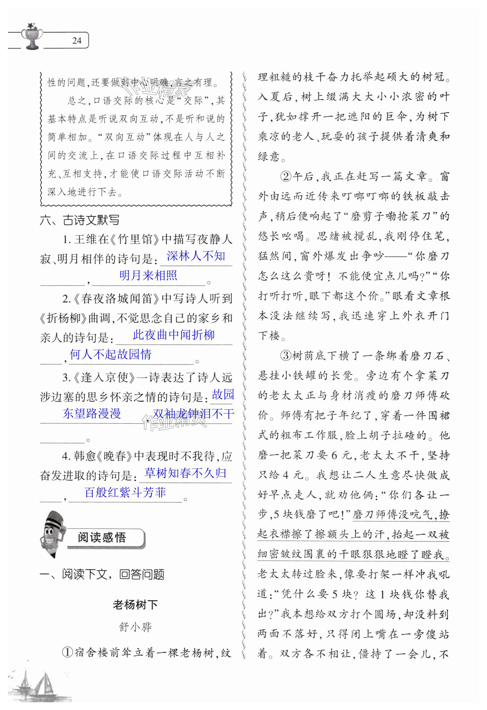 注:目前有些书本章节名称可能整理的还不是很完善,但都是按照顺序排列的,请同学们按照顺序仔细查找。练习册 2024年暑假作业本大象出版社七年级语文人教版 答案主要是用来给同学们做完题方便对答案用的,请勿直接抄袭。
