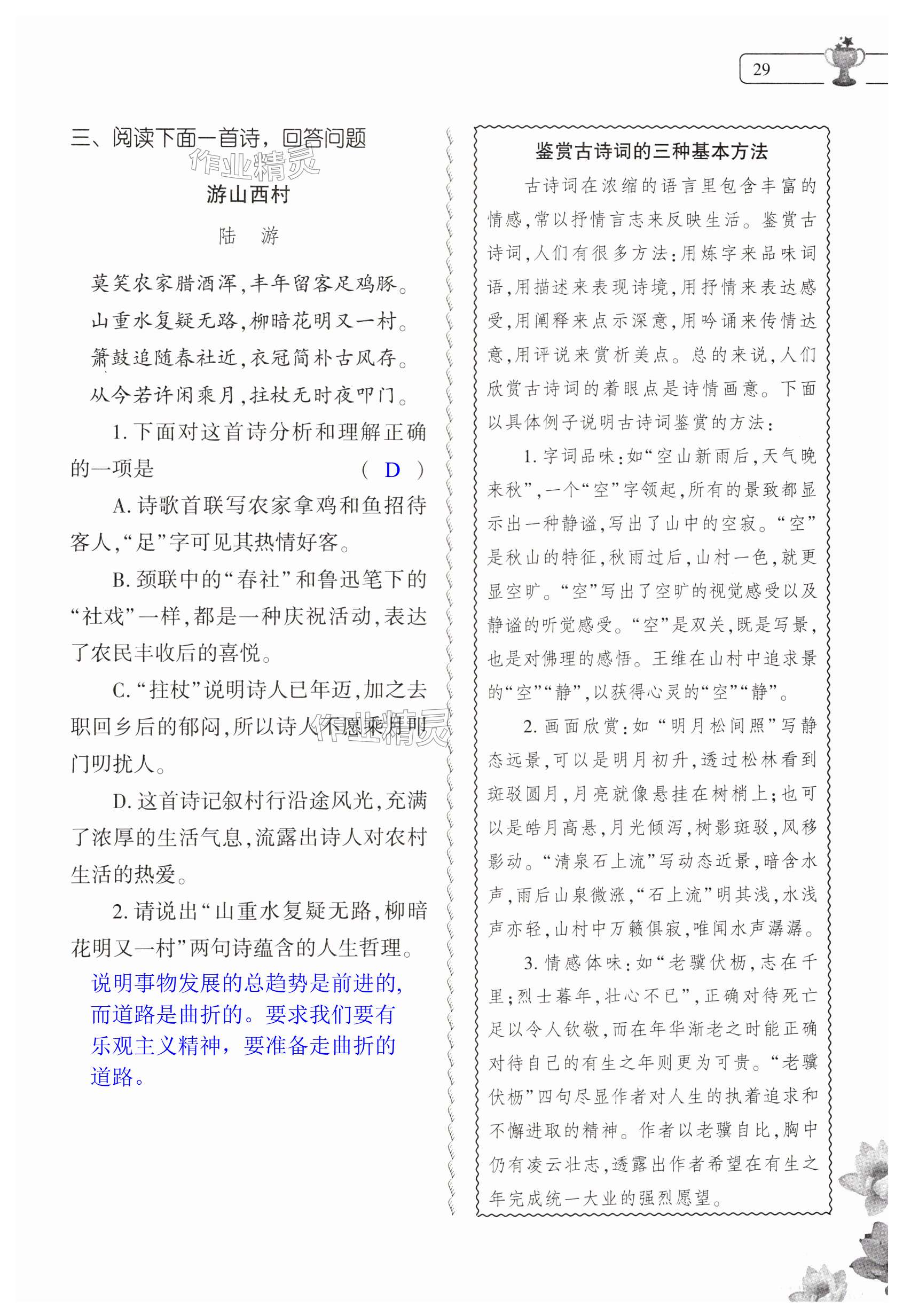 注:目前有些书本章节名称可能整理的还不是很完善,但都是按照顺序排列的,请同学们按照顺序仔细查找。练习册 2024年暑假作业本大象出版社七年级语文人教版 答案主要是用来给同学们做完题方便对答案用的,请勿直接抄袭。