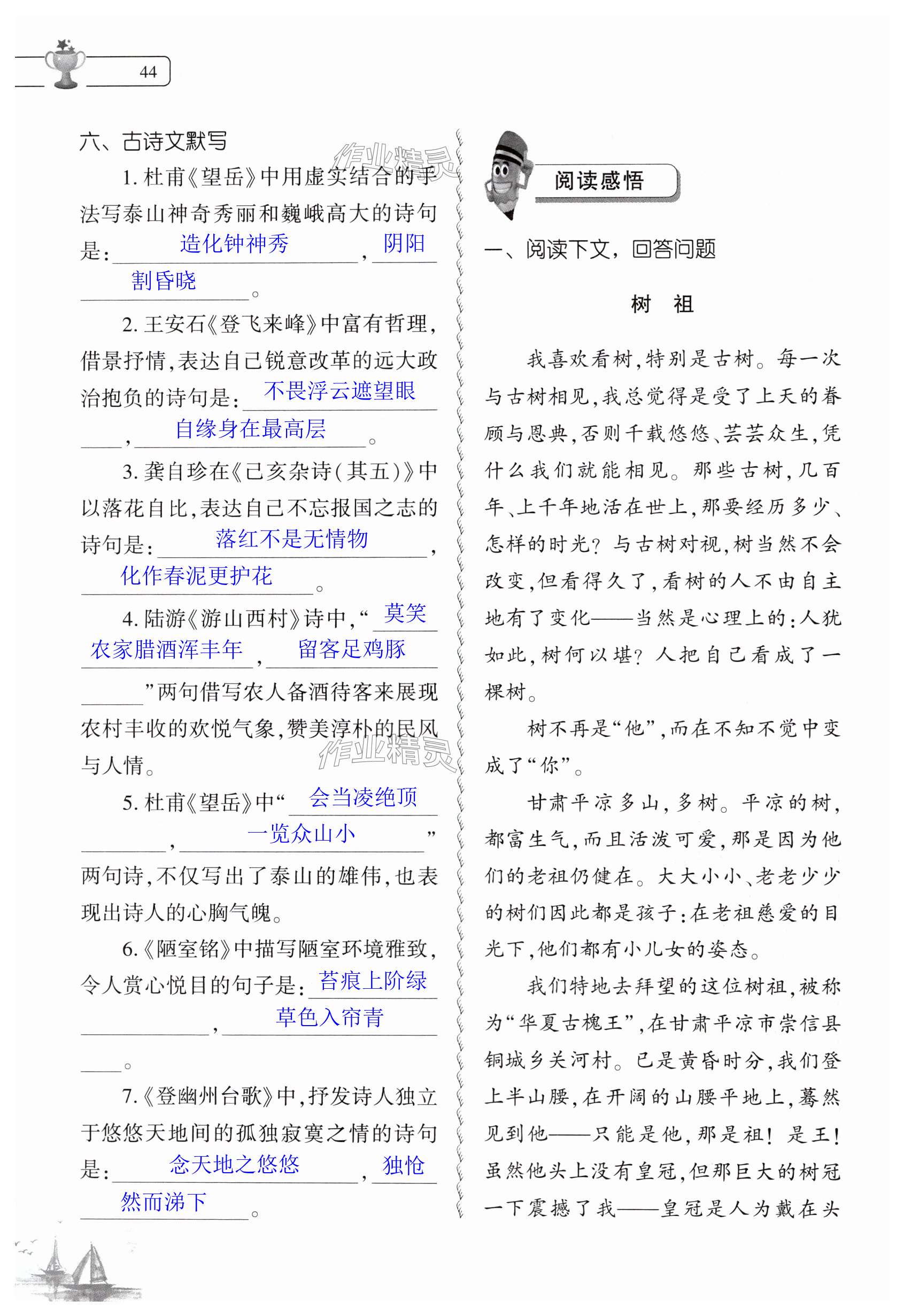 注:目前有些书本章节名称可能整理的还不是很完善,但都是按照顺序排列的,请同学们按照顺序仔细查找。练习册 2024年暑假作业本大象出版社七年级语文人教版 答案主要是用来给同学们做完题方便对答案用的,请勿直接抄袭。