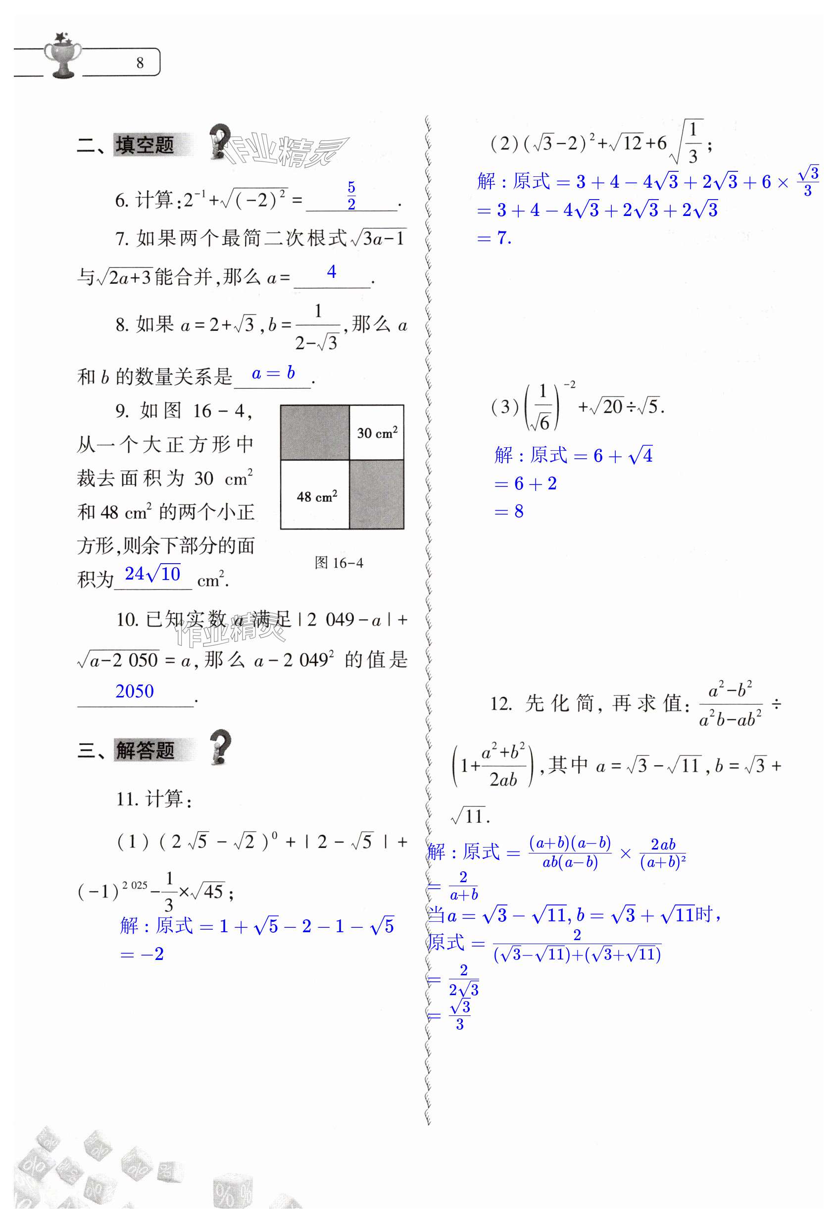 注:目前有些书本章节名称可能整理的还不是很完善,但都是按照顺序排列的,请同学们按照顺序仔细查找。练习册 2024年暑假作业本大象出版社八年级数学人教版 答案主要是用来给同学们做完题方便对答案用的,请勿直接抄袭。
