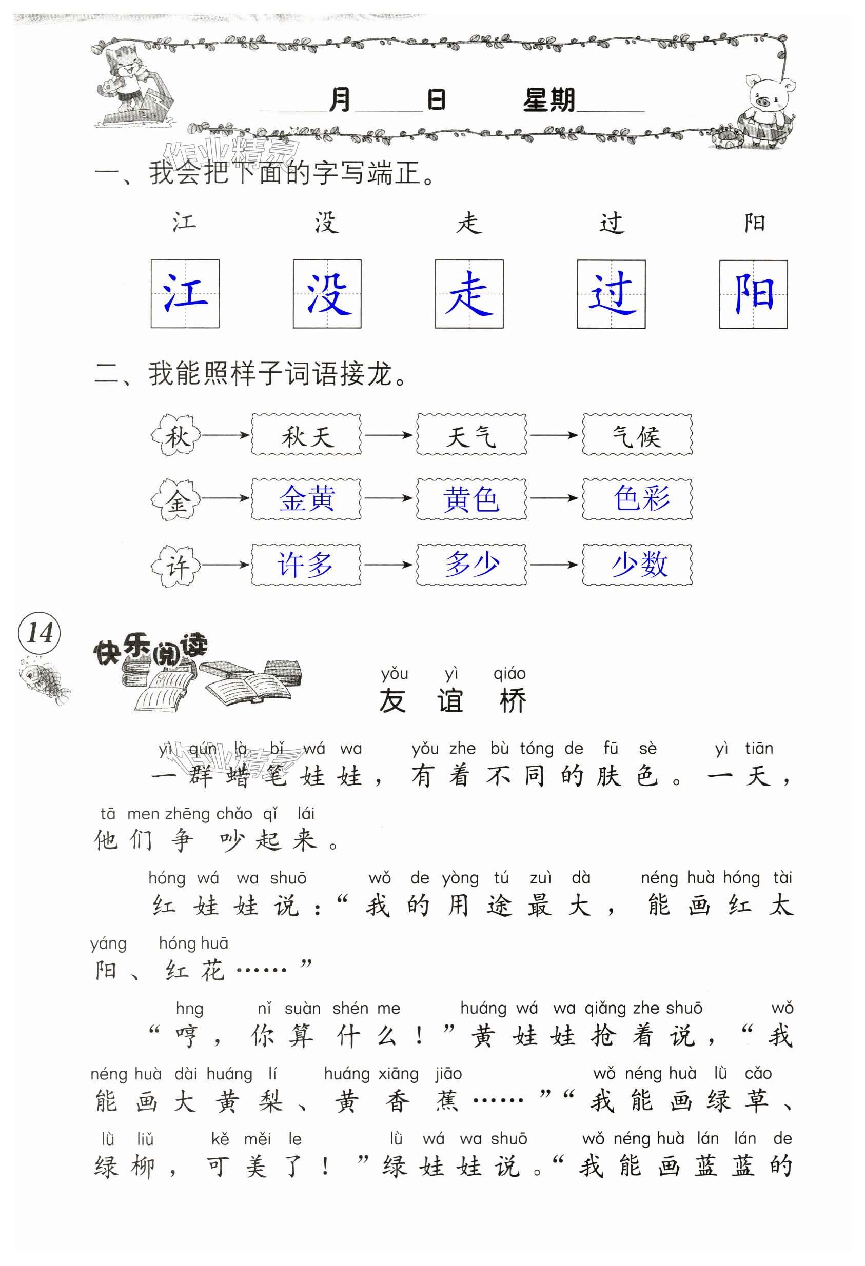 注:目前有些书本章节名称可能整理的还不是很完善,但都是按照顺序排列的,请同学们按照顺序仔细查找。练习册 2024年暑假生活海燕出版社一年级语文人教版 答案主要是用来给同学们做完题方便对答案用的,请勿直接抄袭。