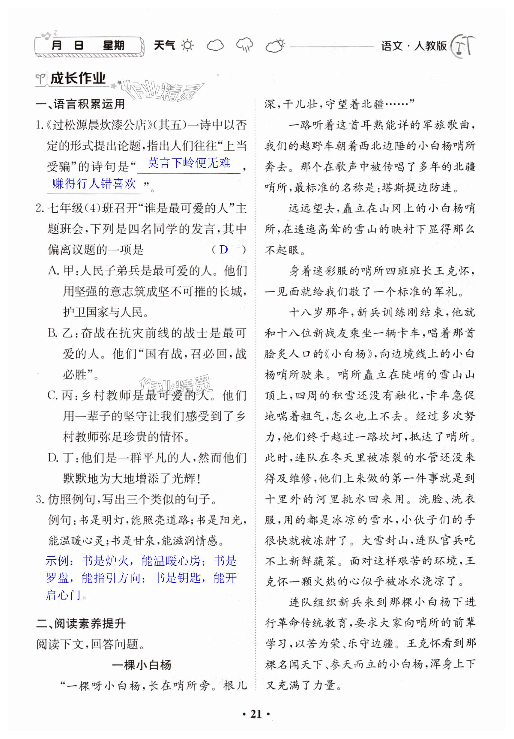 注:目前有些书本章节名称可能整理的还不是很完善,但都是按照顺序排列的,请同学们按照顺序仔细查找。练习册 2024年暑假作业江西高校出版社七年级综合人教版2 答案主要是用来给同学们做完题方便对答案用的,请勿直接抄袭。