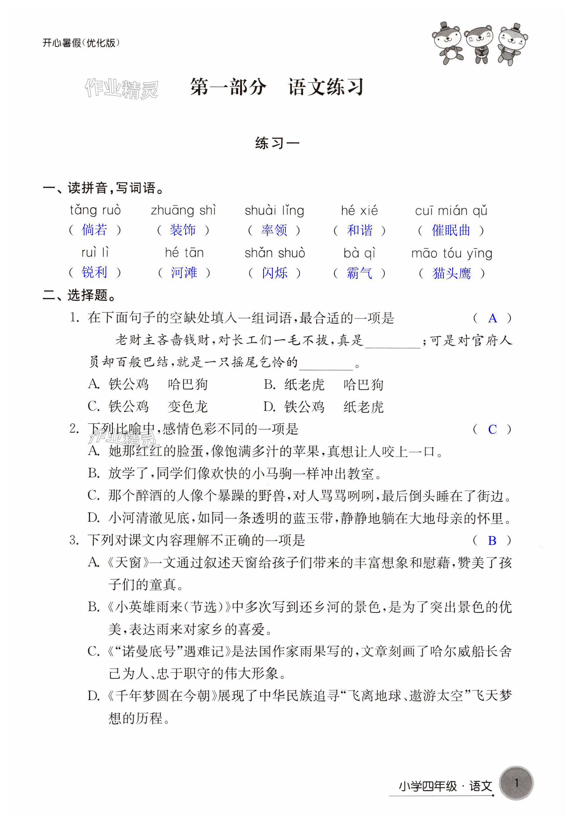 注:目前有些书本章节名称可能整理的还不是很完善,但都是按照顺序排列的,请同学们按照顺序仔细查找。练习册 2024年开心暑假小学四年级优化版译林出版社 答案主要是用来给同学们做完题方便对答案用的,请勿直接抄袭。