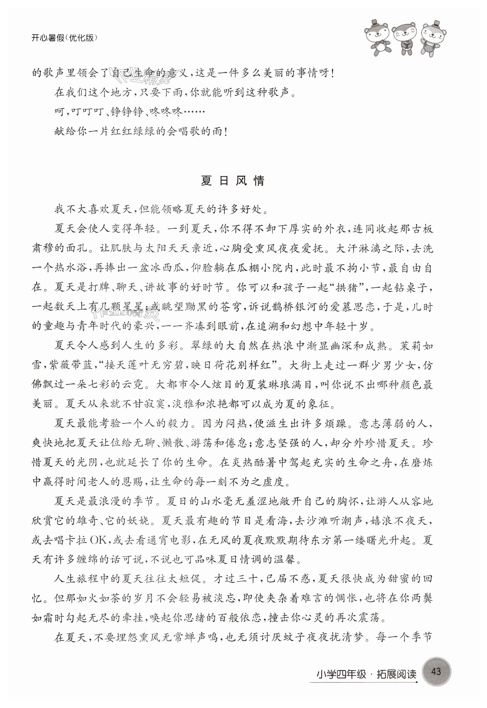 注:目前有些书本章节名称可能整理的还不是很完善,但都是按照顺序排列的,请同学们按照顺序仔细查找。练习册 2024年开心暑假小学四年级优化版译林出版社 答案主要是用来给同学们做完题方便对答案用的,请勿直接抄袭。