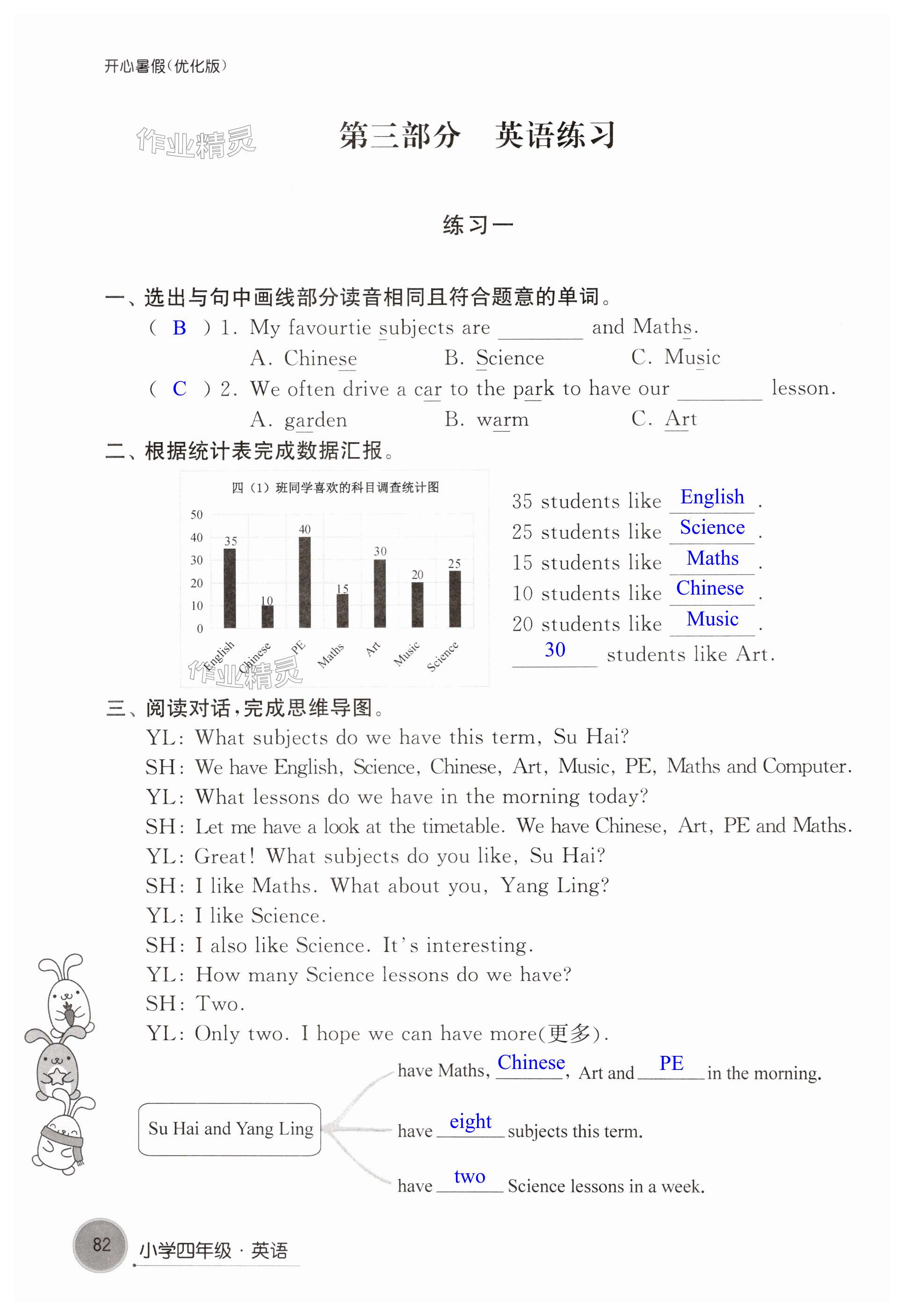 注:目前有些书本章节名称可能整理的还不是很完善,但都是按照顺序排列的,请同学们按照顺序仔细查找。练习册 2024年开心暑假小学四年级优化版译林出版社 答案主要是用来给同学们做完题方便对答案用的,请勿直接抄袭。