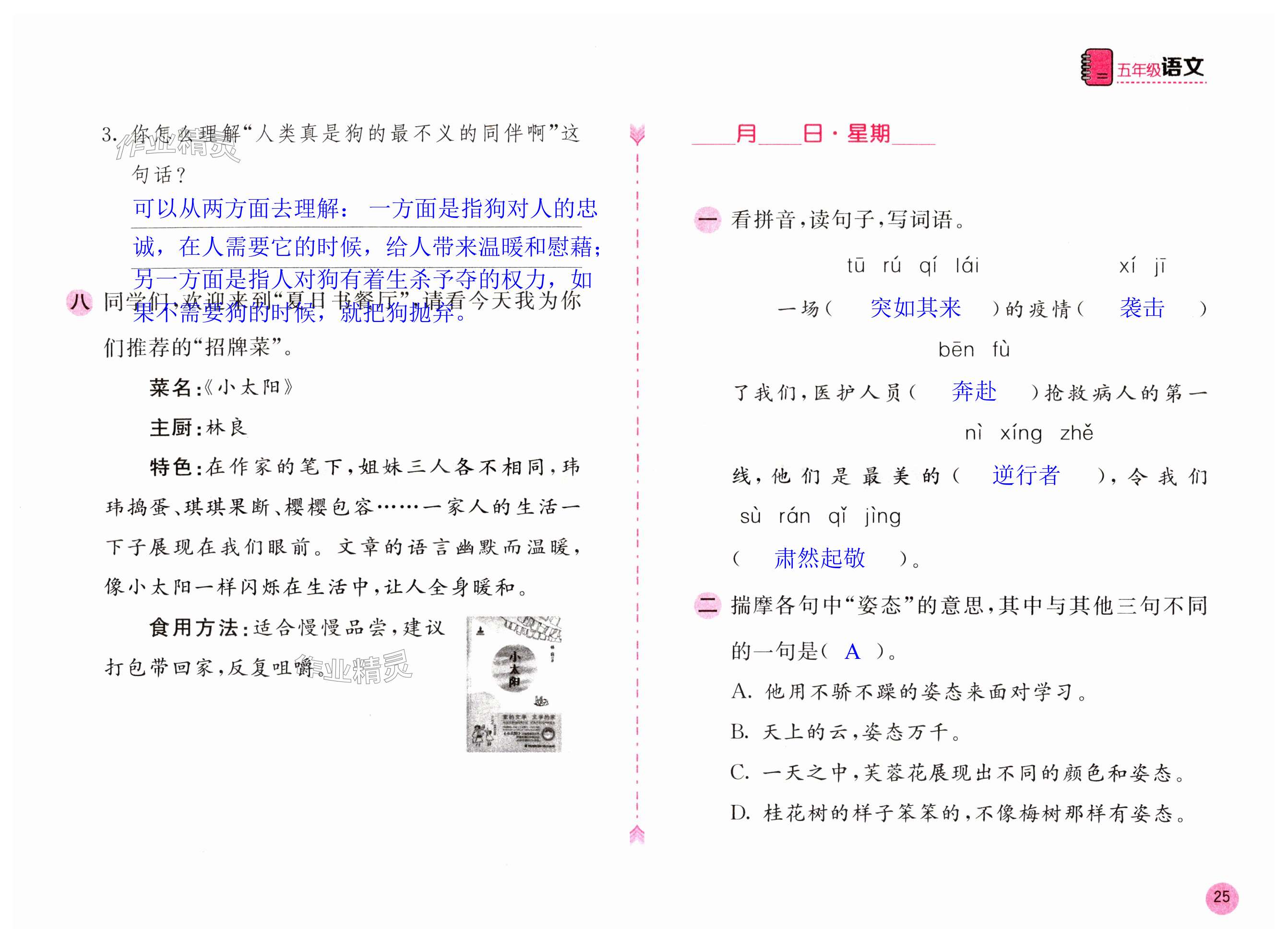 注:目前有些书本章节名称可能整理的还不是很完善,但都是按照顺序排列的,请同学们按照顺序仔细查找。练习册 2024年暑假作业安徽少年儿童出版社五年级语文人教版 答案主要是用来给同学们做完题方便对答案用的,请勿直接抄袭。