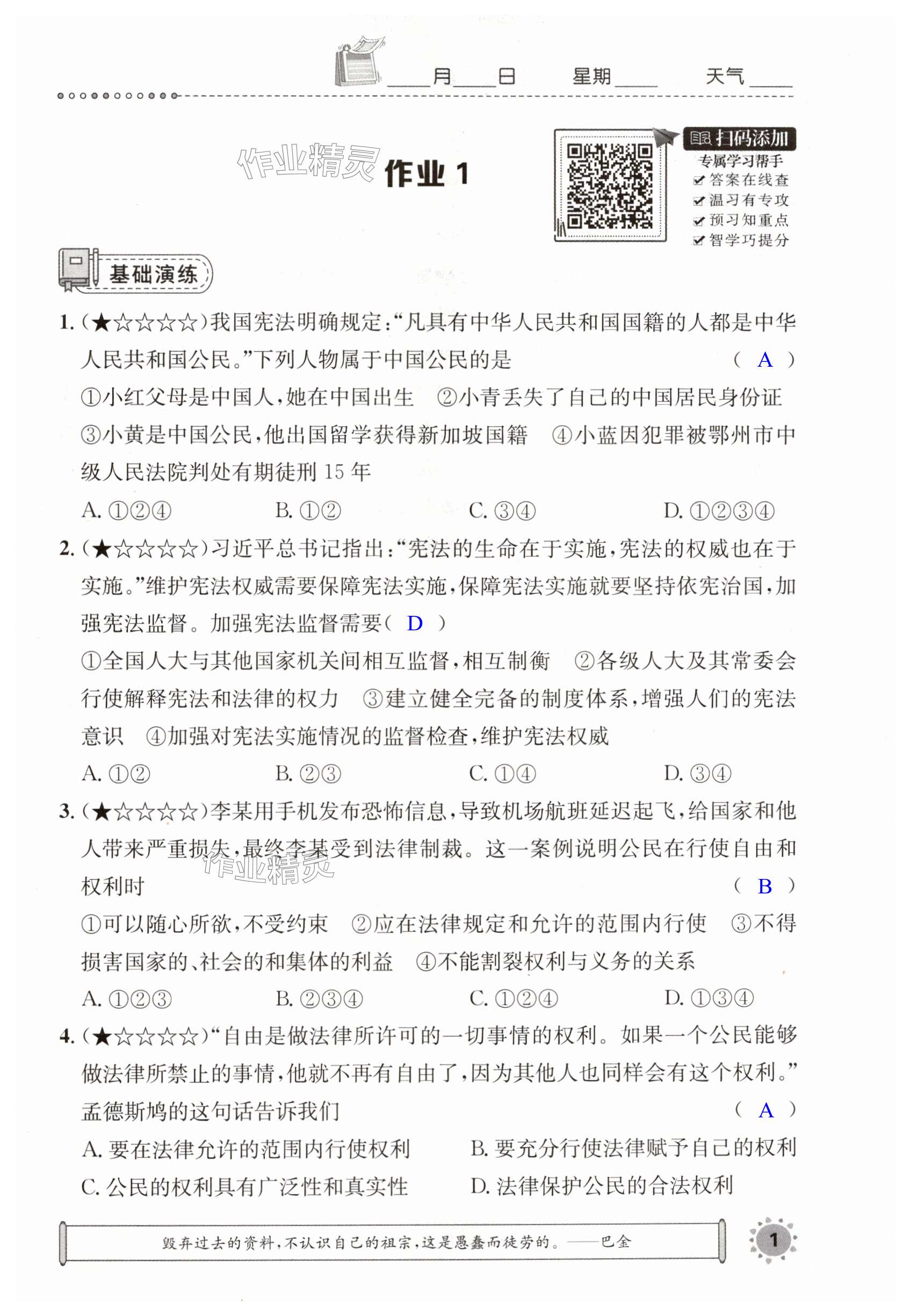 注:目前有些书本章节名称可能整理的还不是很完善,但都是按照顺序排列的,请同学们按照顺序仔细查找。练习册 2024年长江暑假作业八年级道德与法治崇文书局 答案主要是用来给同学们做完题方便对答案用的,请勿直接抄袭。