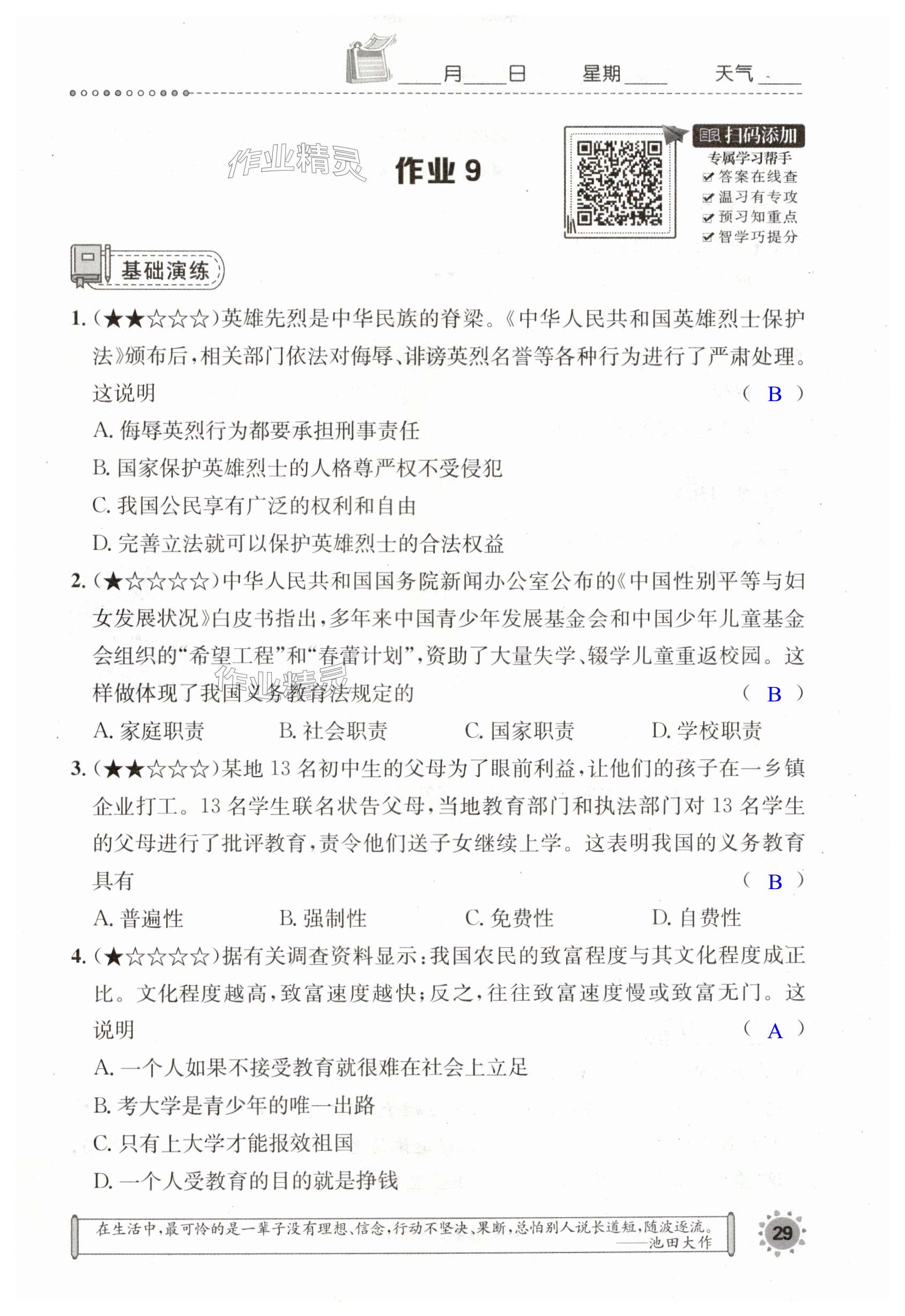 注:目前有些书本章节名称可能整理的还不是很完善,但都是按照顺序排列的,请同学们按照顺序仔细查找。练习册 2024年长江暑假作业八年级道德与法治崇文书局 答案主要是用来给同学们做完题方便对答案用的,请勿直接抄袭。