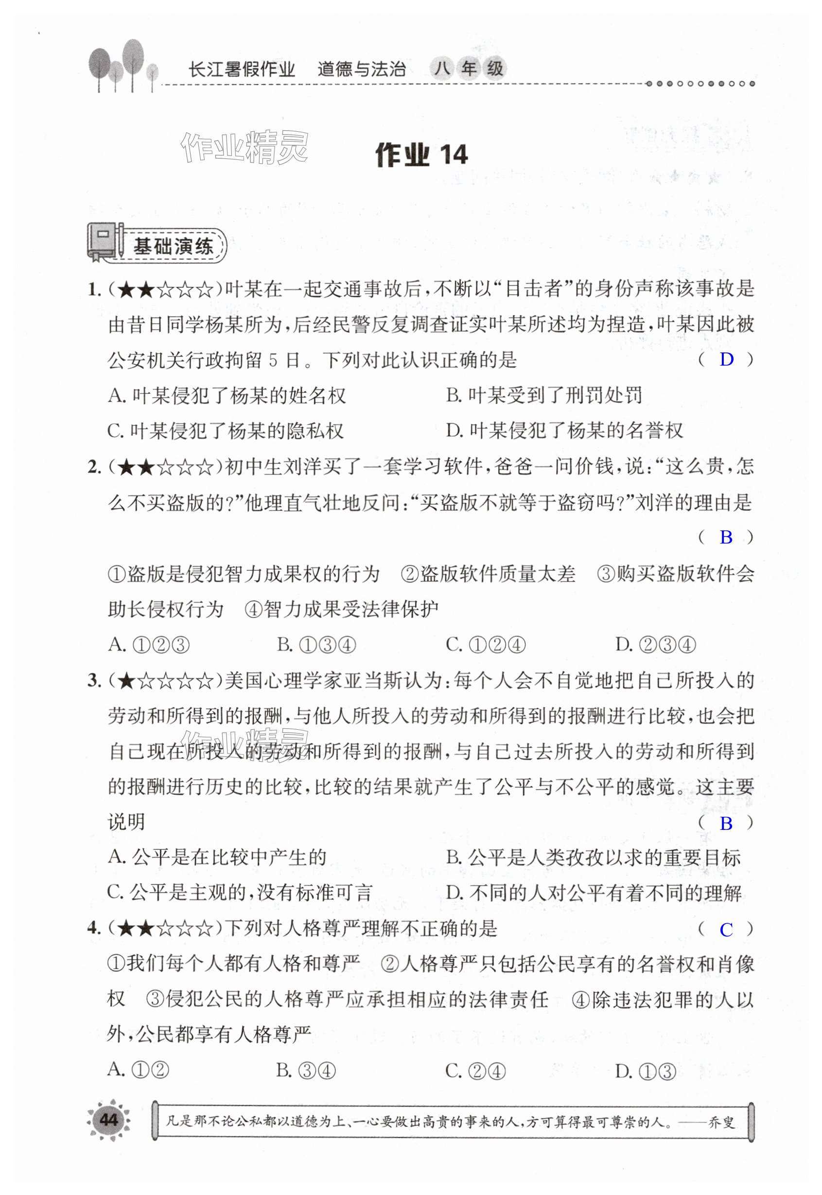 注:目前有些书本章节名称可能整理的还不是很完善,但都是按照顺序排列的,请同学们按照顺序仔细查找。练习册 2024年长江暑假作业八年级道德与法治崇文书局 答案主要是用来给同学们做完题方便对答案用的,请勿直接抄袭。