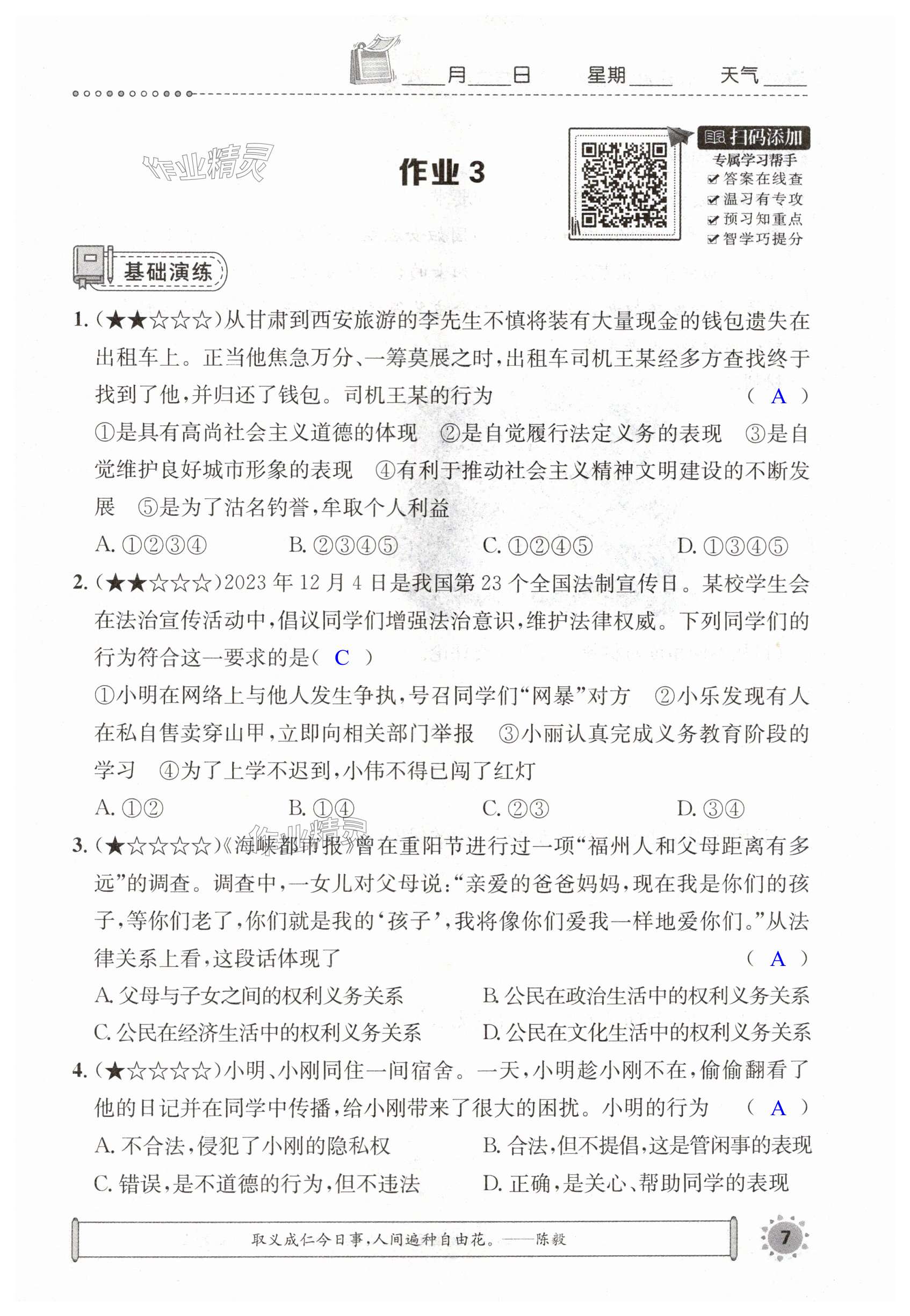 注:目前有些书本章节名称可能整理的还不是很完善,但都是按照顺序排列的,请同学们按照顺序仔细查找。练习册 2024年长江暑假作业八年级道德与法治崇文书局 答案主要是用来给同学们做完题方便对答案用的,请勿直接抄袭。