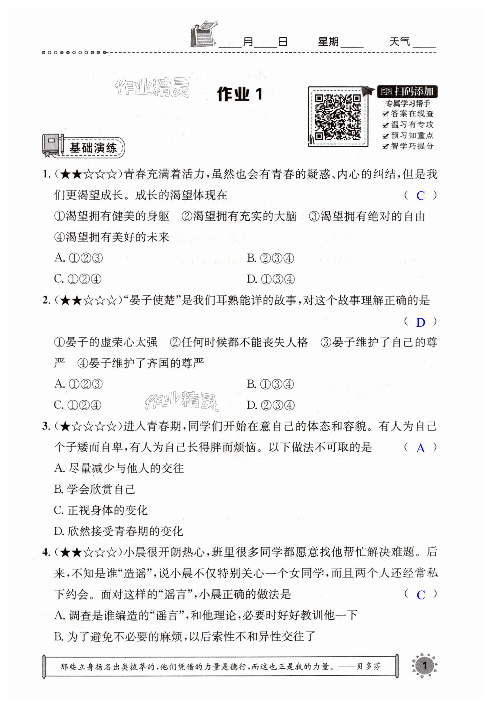 注:目前有些书本章节名称可能整理的还不是很完善,但都是按照顺序排列的,请同学们按照顺序仔细查找。练习册 2024年长江暑假作业七年级道德与法治崇文书局 答案主要是用来给同学们做完题方便对答案用的,请勿直接抄袭。
