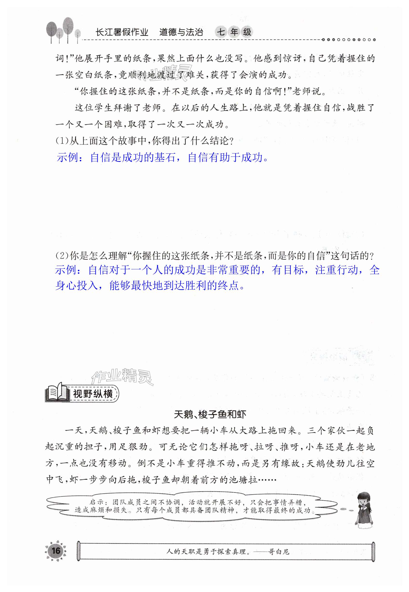 注:目前有些书本章节名称可能整理的还不是很完善,但都是按照顺序排列的,请同学们按照顺序仔细查找。练习册 2024年长江暑假作业七年级道德与法治崇文书局 答案主要是用来给同学们做完题方便对答案用的,请勿直接抄袭。