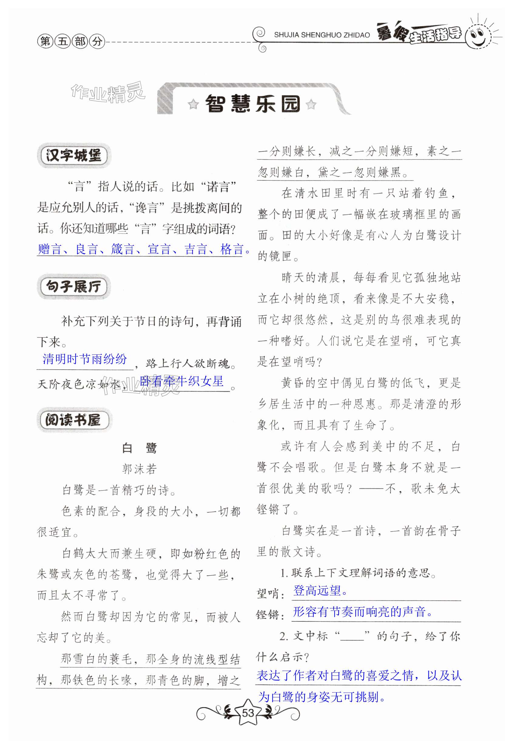 注:目前有些书本章节名称可能整理的还不是很完善,但都是按照顺序排列的,请同学们按照顺序仔细查找。练习册 2024年暑假生活指导五年级山东教育出版社 答案主要是用来给同学们做完题方便对答案用的,请勿直接抄袭。