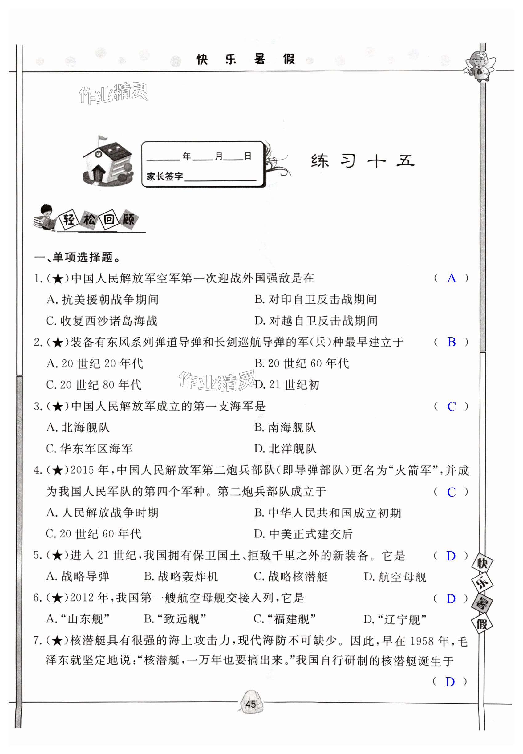 注:目前有些书本章节名称可能整理的还不是很完善,但都是按照顺序排列的,请同学们按照顺序仔细查找。练习册 2024年Happy暑假作业快乐暑假武汉大学出版社八年级历史 答案主要是用来给同学们做完题方便对答案用的,请勿直接抄袭。