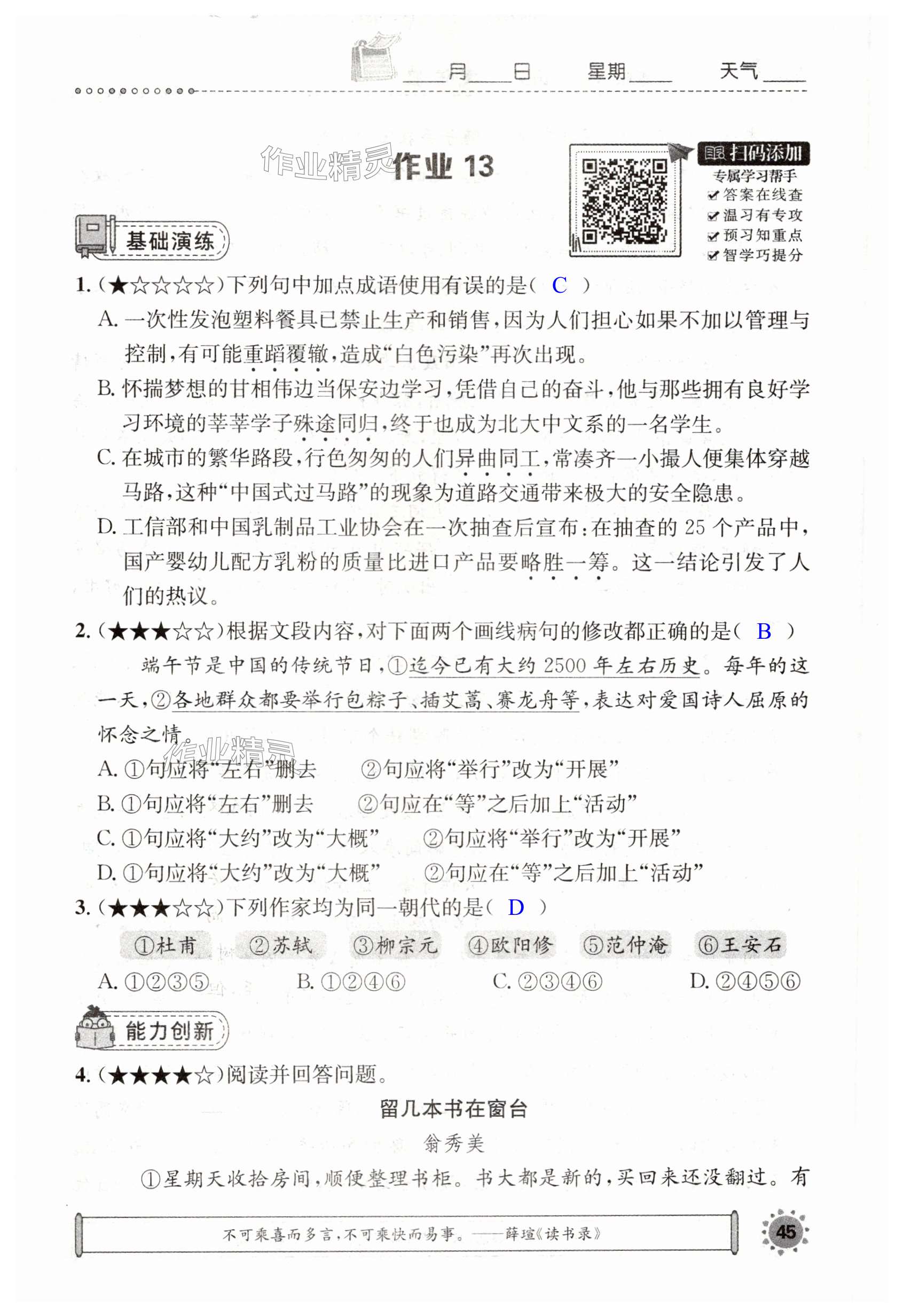 注:目前有些书本章节名称可能整理的还不是很完善,但都是按照顺序排列的,请同学们按照顺序仔细查找。练习册 2024年长江暑假作业八年级语文崇文书局 答案主要是用来给同学们做完题方便对答案用的,请勿直接抄袭。