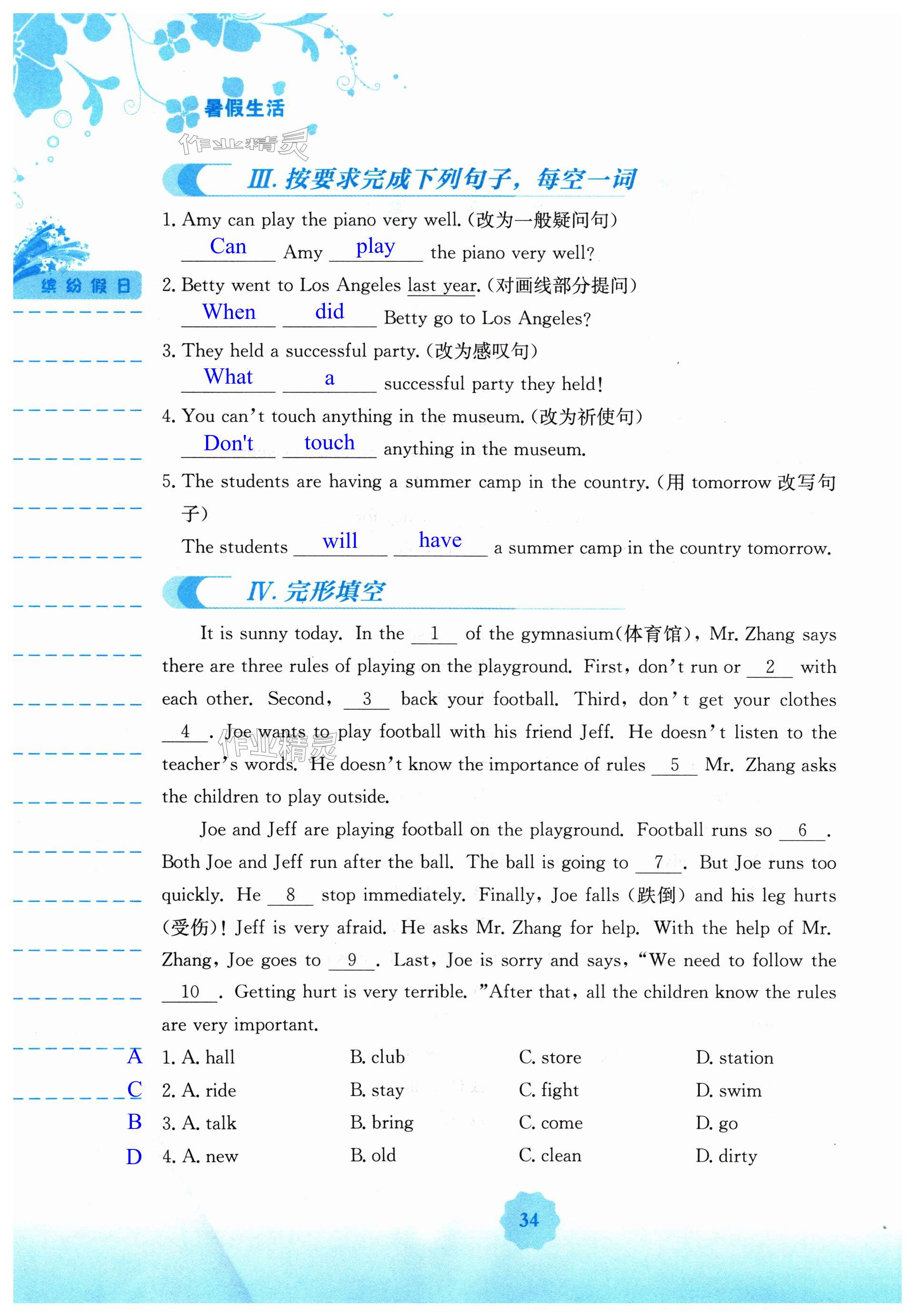注:目前有些书本章节名称可能整理的还不是很完善,但都是按照顺序排列的,请同学们按照顺序仔细查找。练习册 2024年暑假生活七年级英语人教版安徽教育出版社 答案主要是用来给同学们做完题方便对答案用的,请勿直接抄袭。