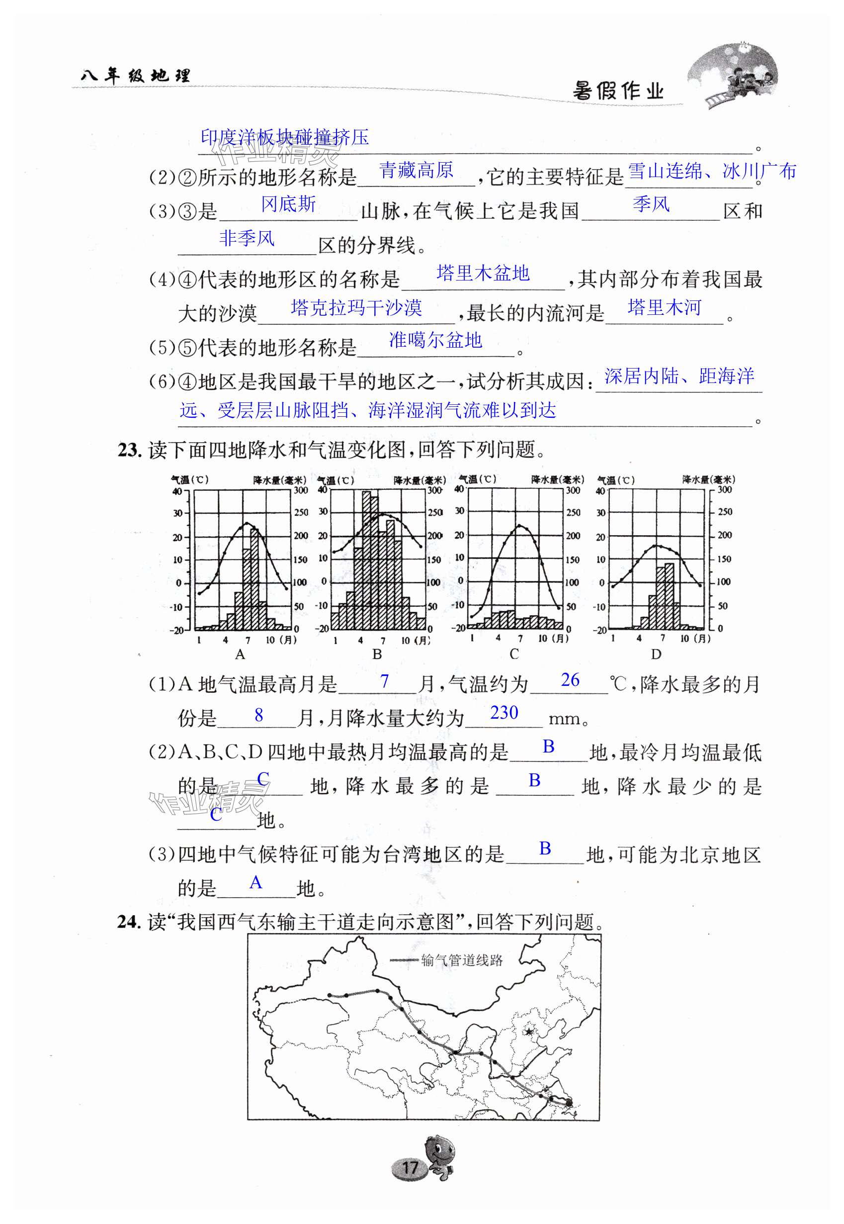 注:目前有些书本章节名称可能整理的还不是很完善,但都是按照顺序排列的,请同学们按照顺序仔细查找。练习册 2024年暑假作业长江出版社八年级地理人教版 答案主要是用来给同学们做完题方便对答案用的,请勿直接抄袭。